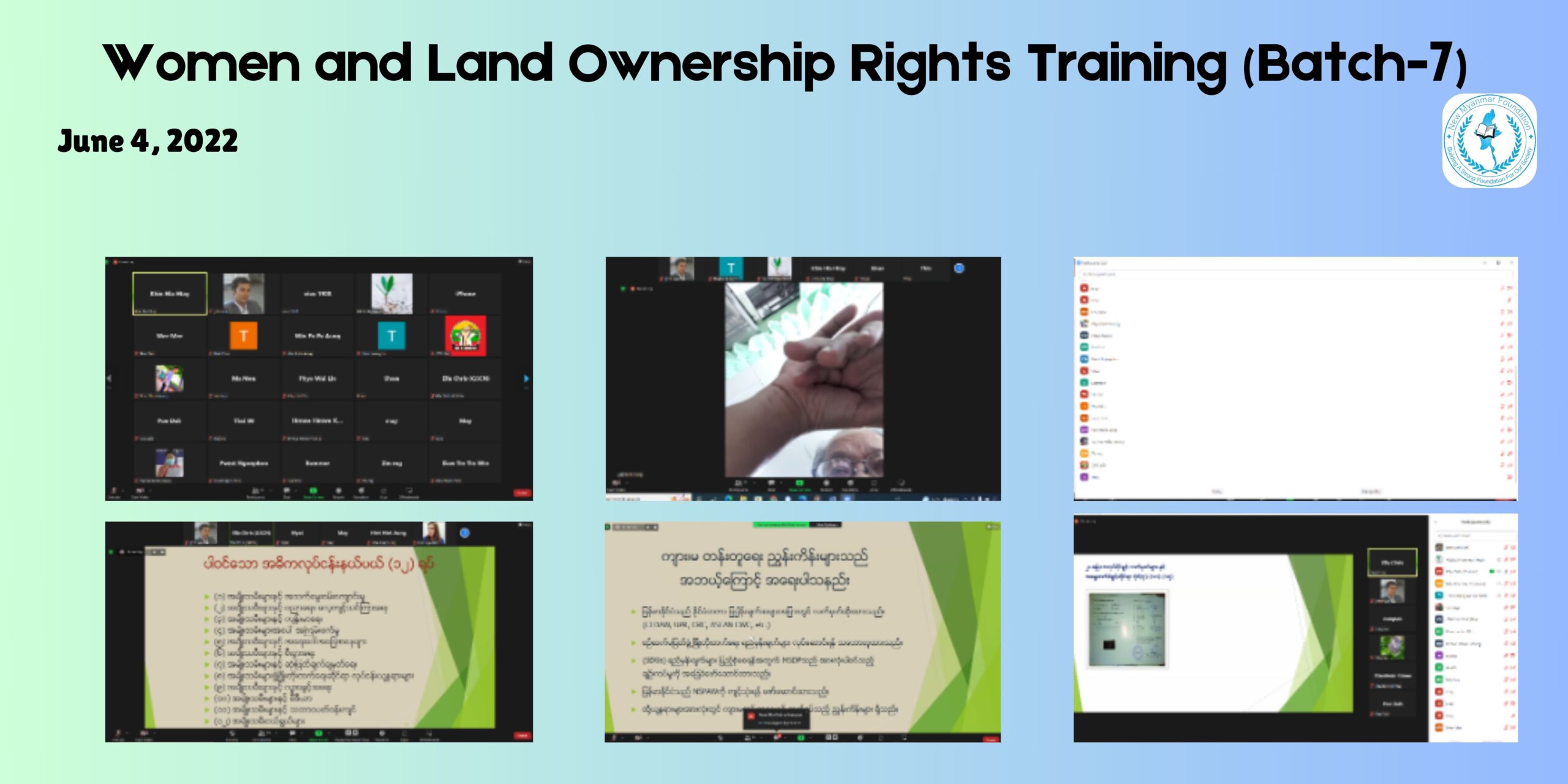 On June 4, 2022, the New Myanmar Foundation (NMF) and its partners, the Women Lead Resource Center (WLRC) organized an online Zoom meeting titled “Women and Land Rights Training (Batch-7)” aimed at increasing women’s ownership of land and their participation in various sectors. The training, conducted from 16:00 to 18:00 Thai time, featured Daw Ohnmar Aung Min as the lecturer. The session began with an opening speech by Dr. San Aung, followed by Daw Ohnmar Aung Min’s comprehensive presentation on gender discrimination, CEDAW, and women’s rights, focusing particularly on land ownership.