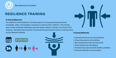 In June 18, 2022, the New Myanmar Foundation (NMF), with the support of FHI 360, conducted a Resilience Training for 33 Internally Displaced Persons (IDPs) and migrants at safe houses in Maesot, Thailand, consisting of 19 males, 10 females, and 4 others. The training aimed to enhance psychological resilience, provide stress and trauma management strategies, and foster a supportive community network. Over 18 hours of interactive lectures, group activities, mindfulness exercises, and practical role-plays, participants developed a deeper understanding of resilience, improved their mental well-being, and formed stronger community ties.