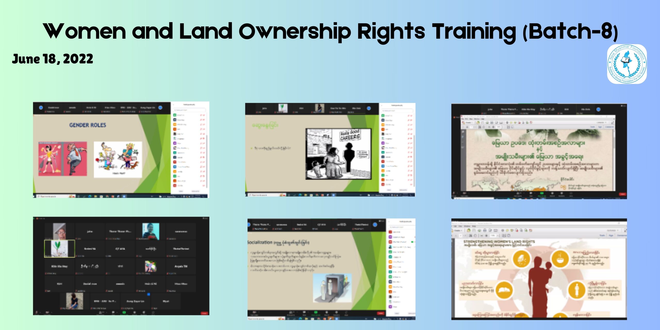 On June 18, 2022, the New Myanmar Foundation (NMF) and Women Lead Resource Center (WLRC) organized an online training titled “Women and Land Rights (Batch-8)” with the objective of enhancing women’s land ownership and participation in various sectors. The session, conducted from 16:00 to 18:00 Thai Standard Time, was led by Daw Ohnmar Aung Min as the lecturer and 21 participants attended.
