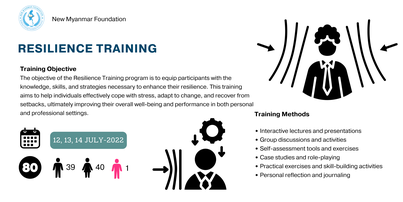 From July 12 to July 14, 2022, the New Myanmar Foundation (NMF), with the support of FHI 360, conducted an online Resilience Training for 81 Human Rights Defenders and Internally Displaced Persons (IDPs) inside Myanmar, consisting of 39 males, 40 females, and 1 other. The training aimed to enhance psychological resilience, provide stress and trauma management strategies, and foster a supportive community network.