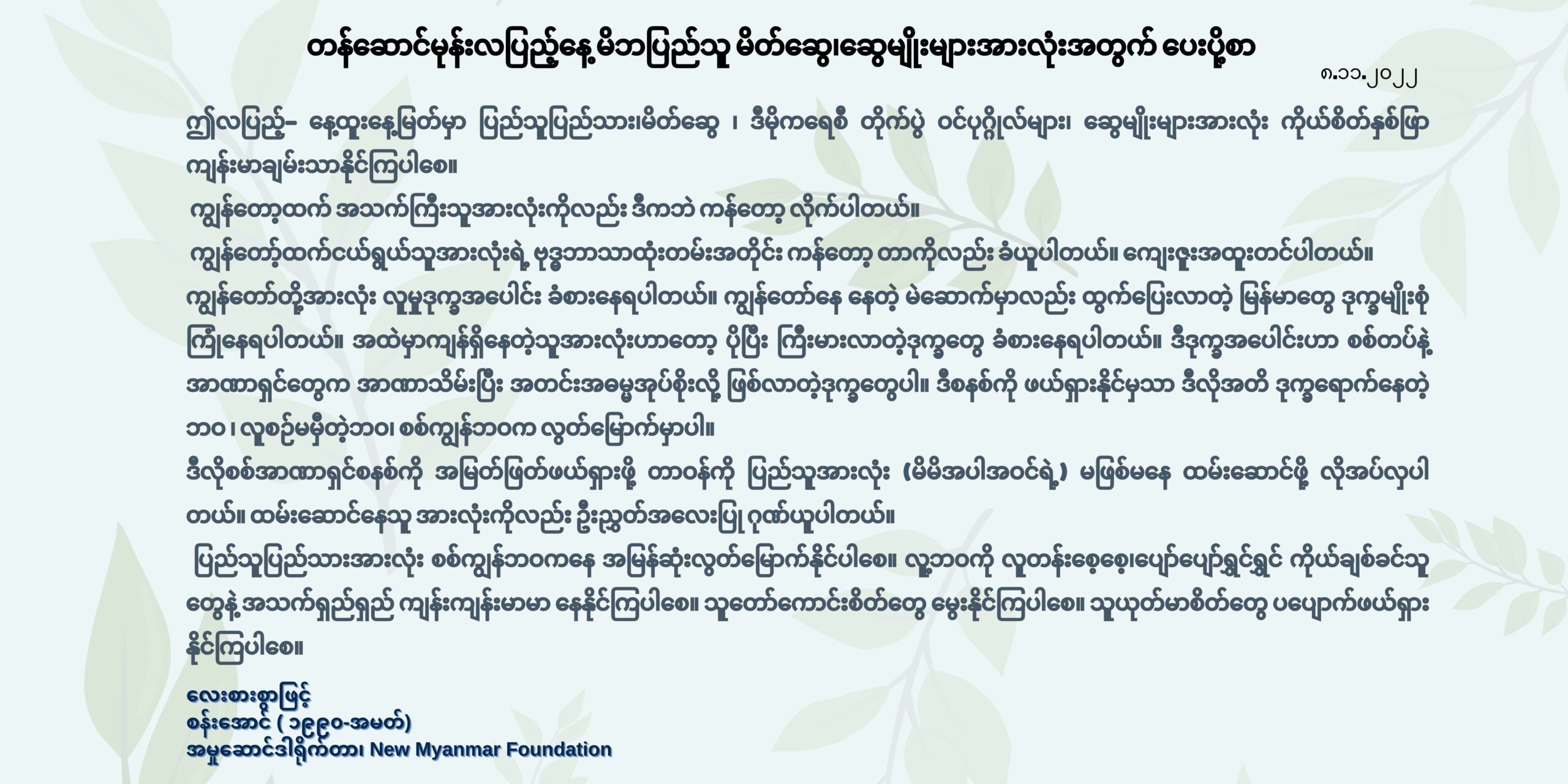 ဤလပြည့်- နေ့ထူးနေ့မြတ်မှာ ပြည်သူပြည်သား၊မိတ်ဆွေ ၊ ဒီမိုကရေစီ တိုက်ပွဲ ဝင်ပုဂ္ဂိုလ်များ၊ ဆွေမျိုးများအားလုံး ကိုယ်စိတ်နှစ်ဖြာ ကျန်းမာချမ်းသာနိုင်ကြပါစေ။ ကျွန်တော့ထက် အသက်ကြီးသူအားလုံးကိုလည်း ဒီကဘဲ ကန်တော့ လိုက်ပါတယ်။ ကျွန်တော့်ထက်ငယ်ရွယ်သူအားလုံးရဲ့ ဗုဒ္ဓဘာသာထုံးတမ်းအတိုင်း ကန်တော့ တာကိုလည်း ခံယူပါတယ်။ ကျေးဇူးအထူးတင်ပါတယ်။ ကျွန်တော်တို့အားလုံး လူမှုဒုက္ခအပေါင်း ခံစားနေရပါတယ်။ ကျွန်တော်နေ နေတဲ့ မဲဆောက်မှာလည်း ထွက်ပြေးလာတဲ့ မြန်မာတွေ ဒုက္ခမျိုးစုံကြုံနေရပါတယ်။ အထဲမှာကျန်ရှိနေတဲ့သူအားလုံးဟာတော့ ပိုပြီး ကြီးမားလာတဲ့ဒုက္ခတွေ ခံစားနေရပါတယ်။ ဒီဒုက္ခအပေါင်းဟာ စစ်တပ်နဲ့ အာဏာရှင်တွေက အာဏာသိမ်းပြီး အတင်းအဓမ္မအုပ်စိုးလို့ ဖြစ်လာတဲ့ဒုက္ခတွေပါ။ ဒီစနစ်ကို ဖယ်ရှားနိုင်မှသာ ဒီလိုအတိ ဒုက္ခရောက်နေတဲ့ဘဝ ၊ လူစဉ်မမှီတဲ့ဘဝ၊ စစ်ကျွန်ဘဝက လွတ်မြောက်မှာပါ။ ဒီလိုစစ်အာဏာရှင်စနစ်ကို အမြတ်ဖြတ်ဖယ်ရှားဖို့ တာဝန်ကို ပြည်သူအားလုံး (မိမိအပါအဝင်ရဲ့) မဖြစ်မနေ ထမ်းဆောင်ဖို့ လိုအပ်လှပါတယ်။ ထမ်းဆောင်နေသူ အားလုံးကိုလည်း ဦးညွှတ်အလေးပြု ဂုဏ်ယူပါတယ်။ ပြည်သူပြည်သားအားလုံး စစ်ကျွန်ဘဝကနေ အမြန်ဆုံးလွတ်မြောက်နိုင်ပါစေ။ လူ့ဘဝကို လူတန်းစေ့စေ့၊ပျော်ပျော်ရွှင်ရွှင် ကိုယ်ချစ်ခင်သူတွေနဲ့ အသက်ရှည်ရှည် ကျန်းကျန်းမာမာ နေနိုင်ကြပါစေ။ သူတော်ကောင်းစိတ်တွေ မွေးနိုင်ကြပါစေ။ သူယုတ်မာစိတ်တွေ ပပျောက်ဖယ်ရှားနိုင်ကြပါစေ။