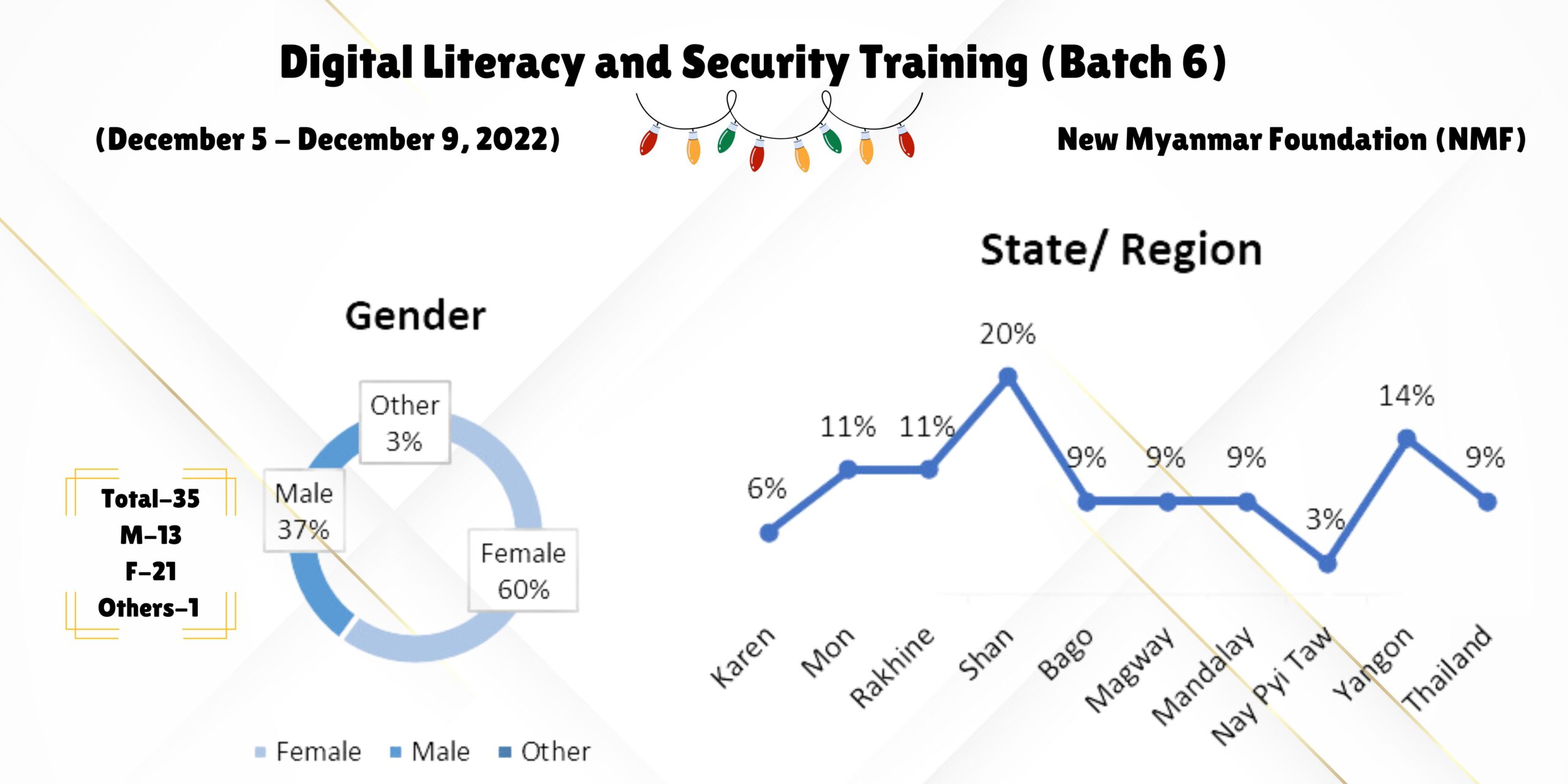 The New Myanmar Foundation (NMF), with the support of Canada Embassy, conducted a five-day online Digital Literacy and Security Training (Batch 6) from December 5 to December 9, 2022, with 40 participants (13 males, 21 females, and 1 LGBT). This training aimed to empower advocates for democracy and human rights in Myanmar by enhancing their digital literacy and security skills. Through an interactive approach including pre-and post-tests, PowerPoint presentations, and participatory planning handouts, participants actively engaged in learning about operating systems, cyber security, internet functionality, VPNs, email services, Google applications, encrypted messaging apps, social media security, and website building.