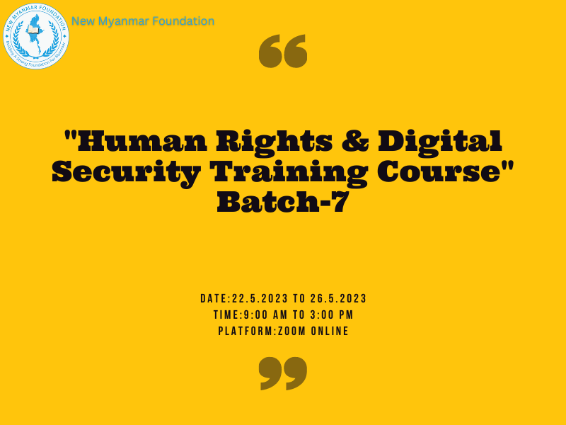New Myanmar Foundation မှ စီစဉ်ကျင်းပသော လူ့အခွင့်အရေး အခြေခံအမြင်ဖွင့်သင်တန်း အပတ်စဉ် (၇) ကို ၂၀၂၃ ခုနှစ်၊ မေလ (၂၂)ရက် မှ (၂၆)ရက် အထိ (၅) ရက်ကြာ ကျင်းပပြုလုပ်သွားမည်ဖြစ်သည်။ ယင်းသင်တန်းတွင်