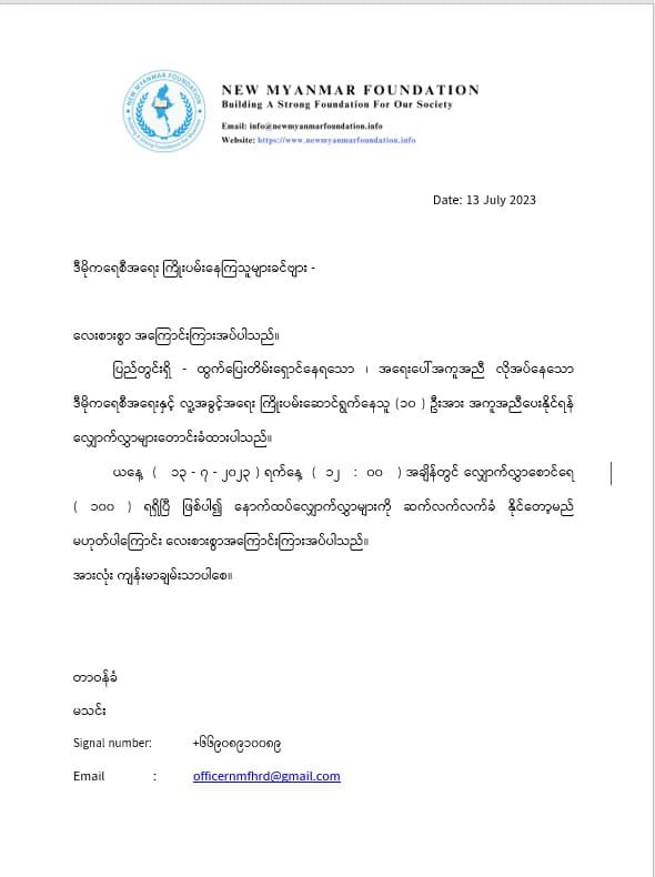 ဒီမိုကရေစီအရေး ကြိုးပမ်းနေကြသူများခင်ဗျား – လေးစားစွာ အကြောင်းကြားအပ်ပါသည်။