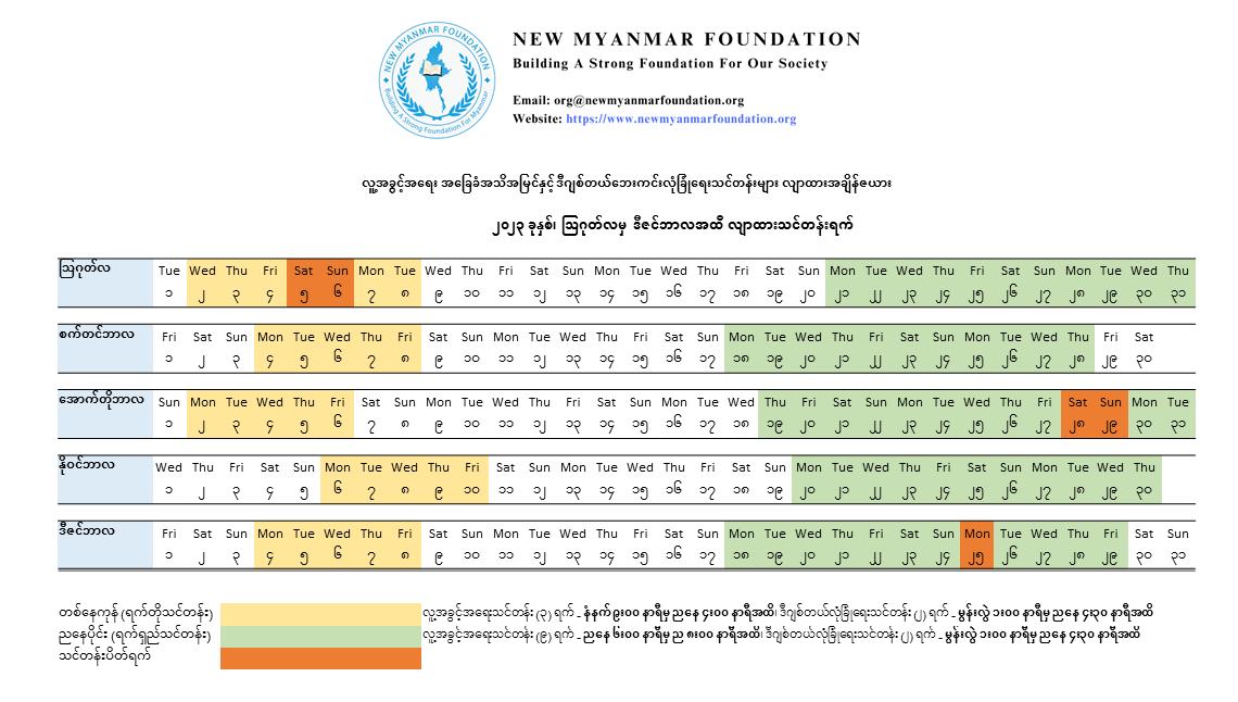 New Myanmar Foundation မှ လူ့အခွင့်အရေးအခြေခံ နှင့် ဒီဂျစ်တယ်ဘေးကင်းလုံခြုံရေး သင်တန်းကို လစဉ် စီစဉ်ကျင်းပလျက်ရှိရာ လျှောက်ထားသူများပြား၍ သင်တန်းတစ်ကြိမ်လျှင် (၂၅)ဦးခန့်သာ လက်ခံနိုင်ခြင်းကြောင့် သင်တန်းတက်ရောက်ရန် လိုအပ်ချက်များကိုက်ညီသော်လည်း တက်ရောက်ခွင့်မရသူများရှိနေသဖြင့် ယခု ဩဂုတ်လတွင် ကျင်းပမည့် အပတ်စဉ် (၁၂) မှစတင်ပြီး ၂၀၂၃ ခုနှစ်၊ ဒီဇင်ဘာလအထိ သင်တန်းများအတွက် ဤလျှောက်လွှာဖောင်ကို ဇူလိုင်လ ၂၀ ရက်နေ့မှ ၂၄ ရက်နေ့အထိ ဖွင့်လှစ်ထားမည်ဖြစ်ပြီး လျှောက်ထားလာသူများထဲမှ သတ်မှတ်ချက်များနှင့်ကိုက်ညီသူ ဦးရေ (၂၅၀) ခန့်အား ကြိုတင်စိစစ်ရွေးချယ်၍ အပတ်စဉ်အလိုက် ဆက်သွယ်သွားမည် ဖြစ်ပါသည်။ သင်တန်းတက်ရောက်ရန် ရွေးချယ်ခံရသူများကိုသာ Email, Signal တို့ဖြင့် ဆက်သွယ်သွားမည် ဖြစ်ပါသည်။