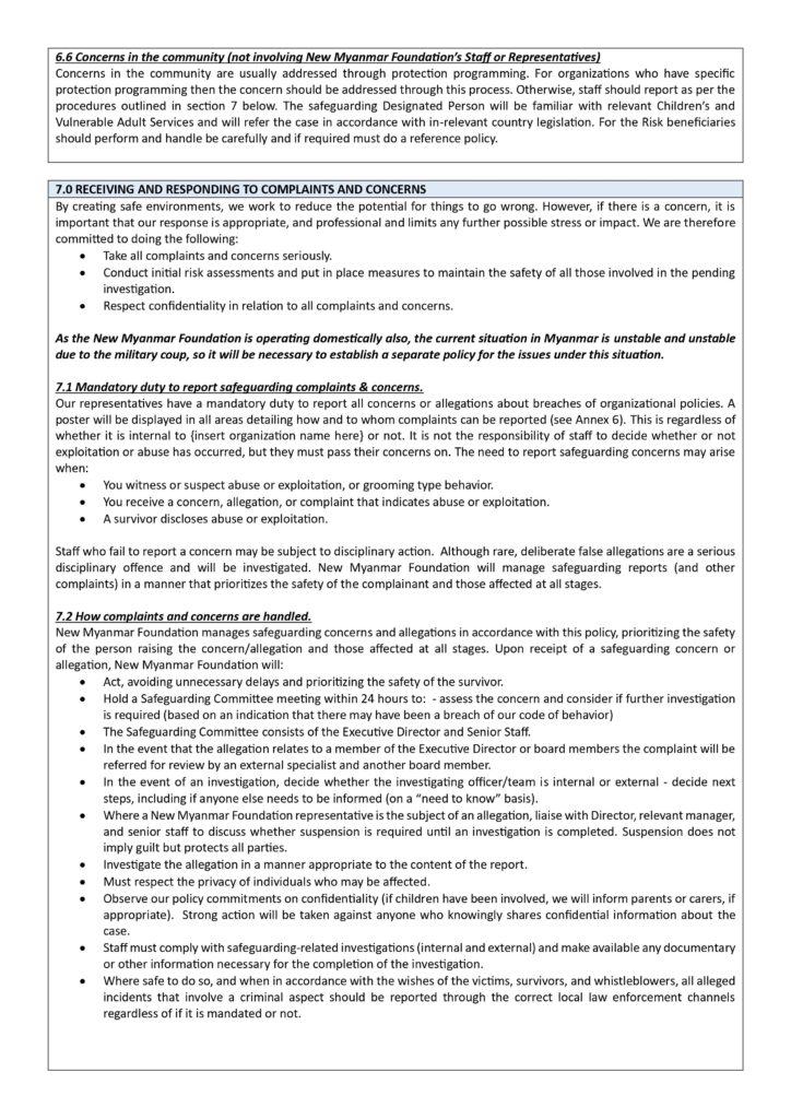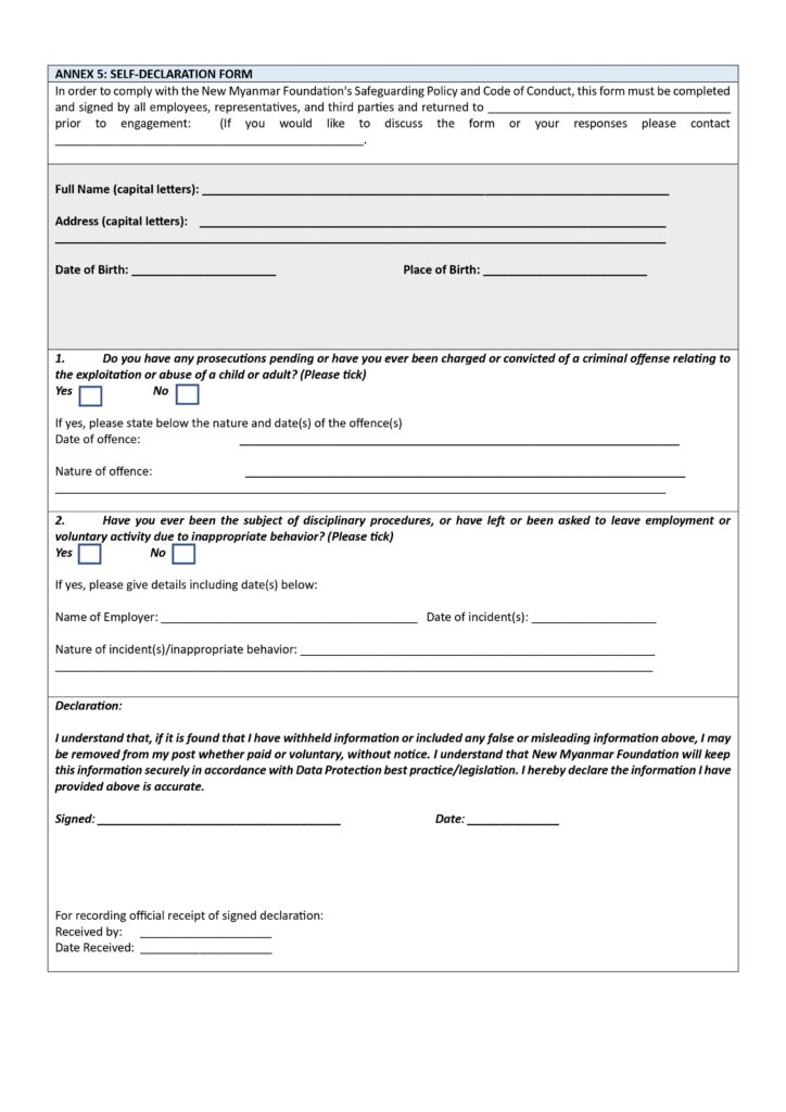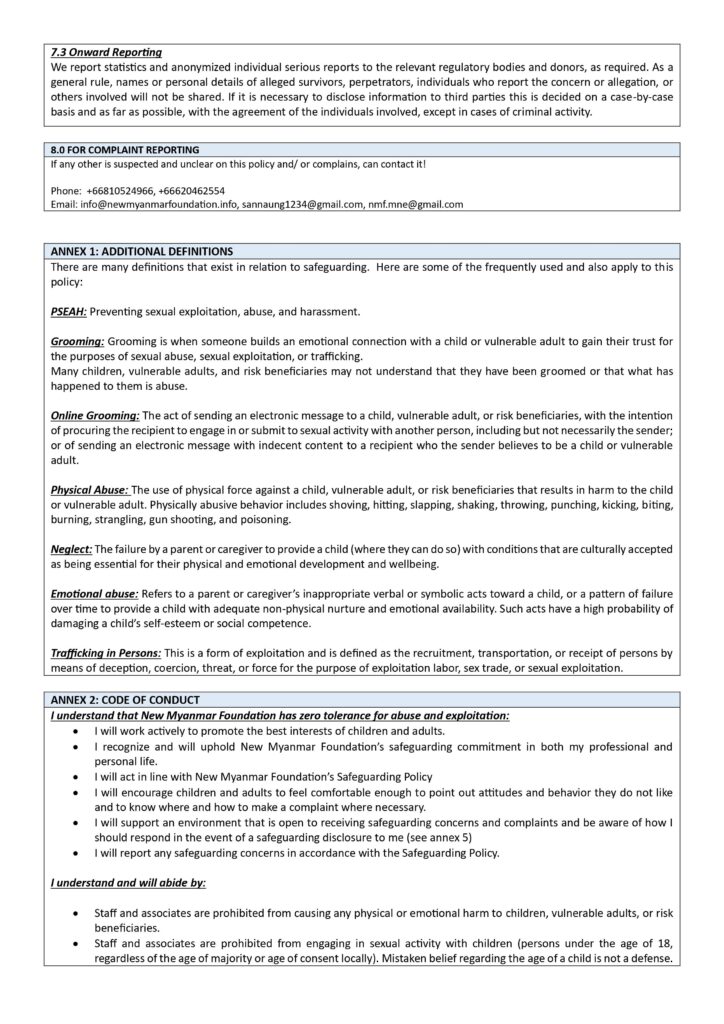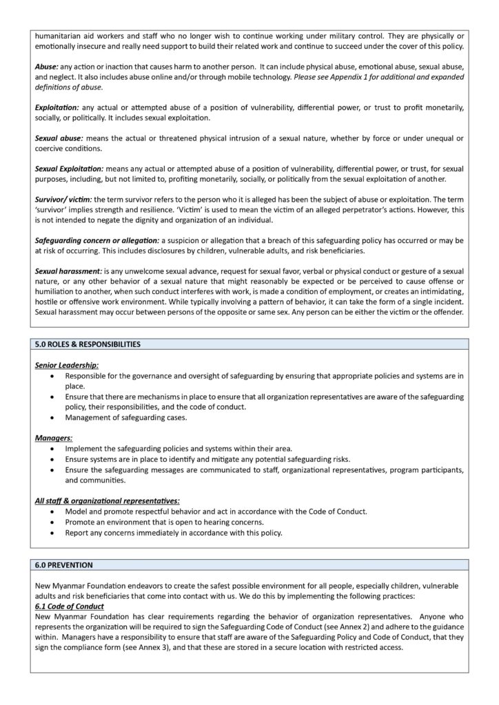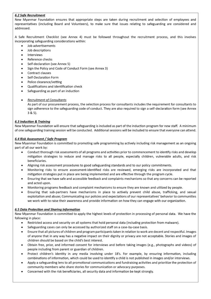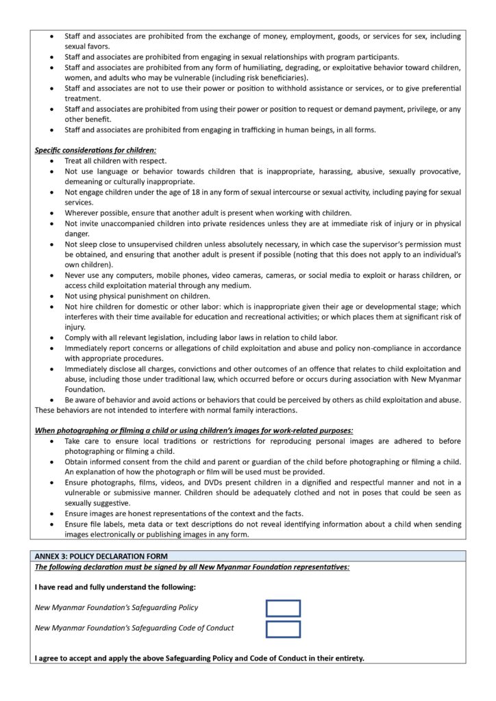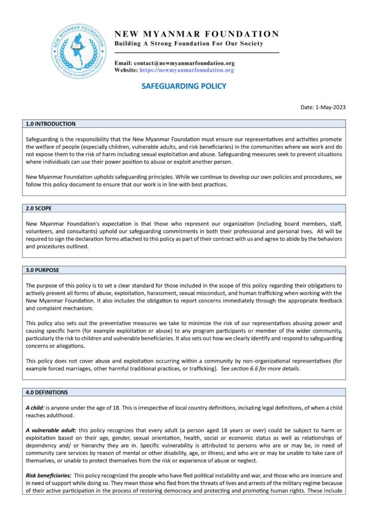 New Myanmar Foundation upholds safeguarding principles. While we continue to develop our own policies and procedures, we follow this policy document to ensure that our work is in line with best practices.