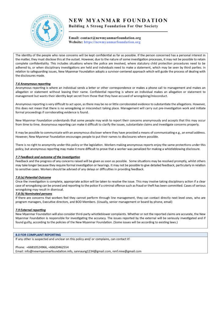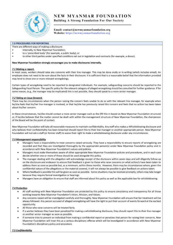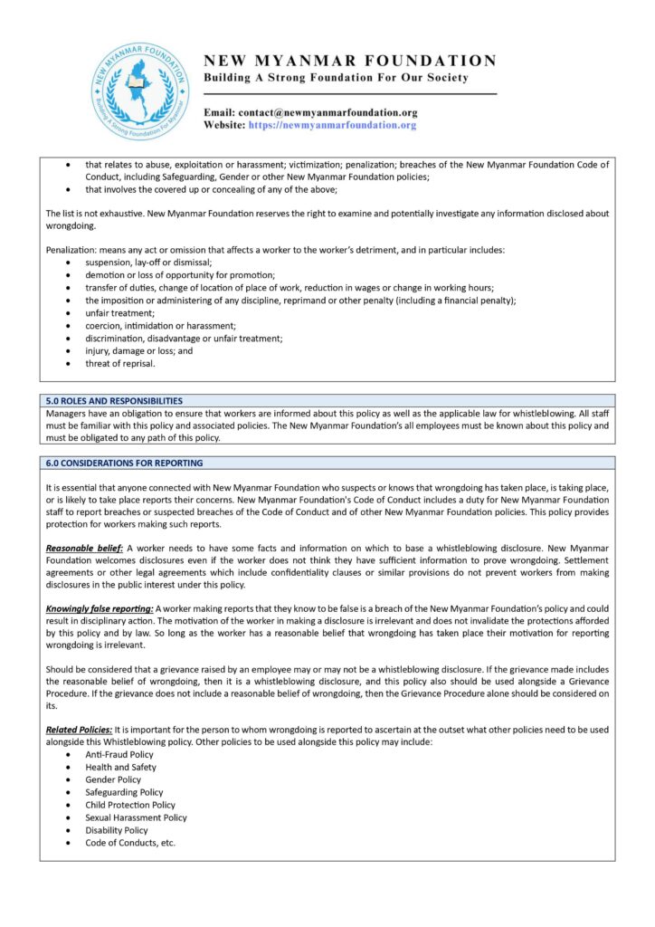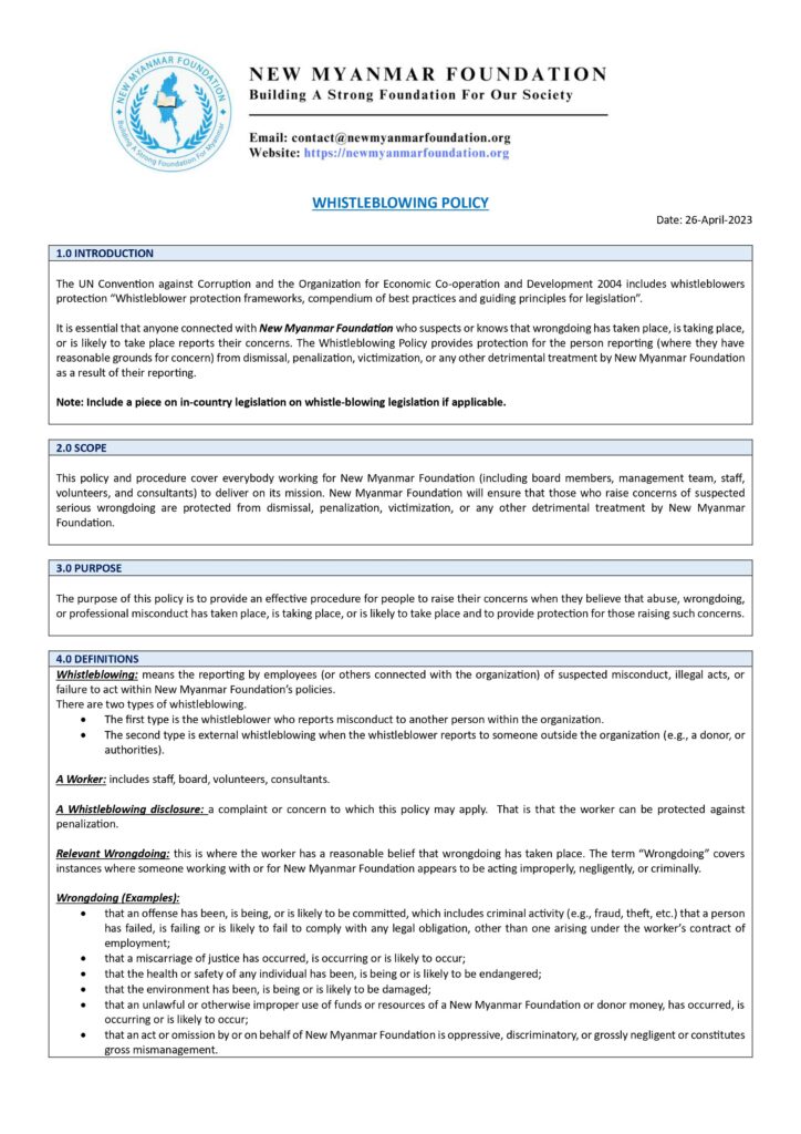 It is essential that anyone connected with New Myanmar Foundation who suspects or knows that wrongdoing has taken place, is taking place, or is likely to take place reports their concerns. The Whistleblowing Policy provides protection for the person reporting (where they have reasonable grounds for concern) from dismissal, penalization, victimization, or any other detrimental treatment by New Myanmar Foundation as a result of their reporting.