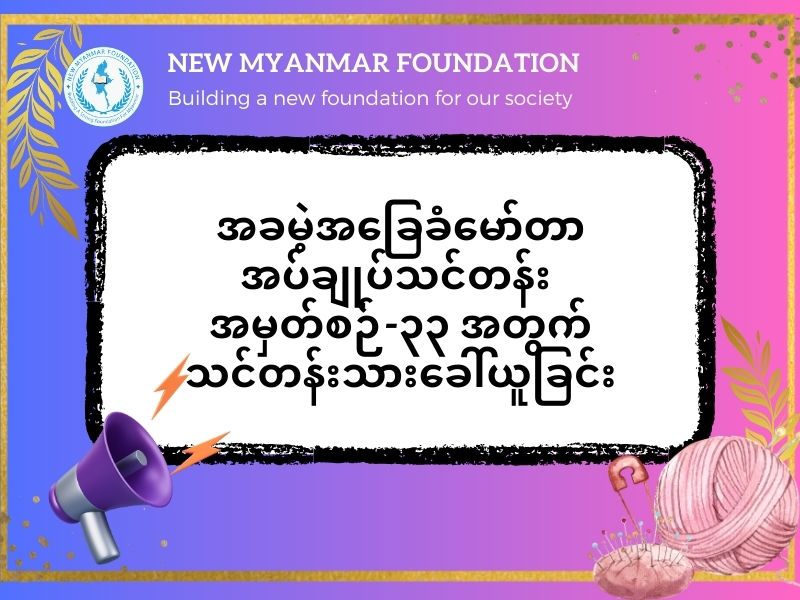၈။ သင်တန်းတက်နေစဉ် New Myanmar Foundation မှ ပို့ချမည့် နေ့တပိုင်း လူ့အခွင့်ရေးအခြေခံသင်တန်း/ အလုပ်သမားအခွင့်ရေး နှင့် အမျိုးသမီးအခွင့်ရေး သင်တန်းများအားလည်း တက်ရောက်ရမည်။