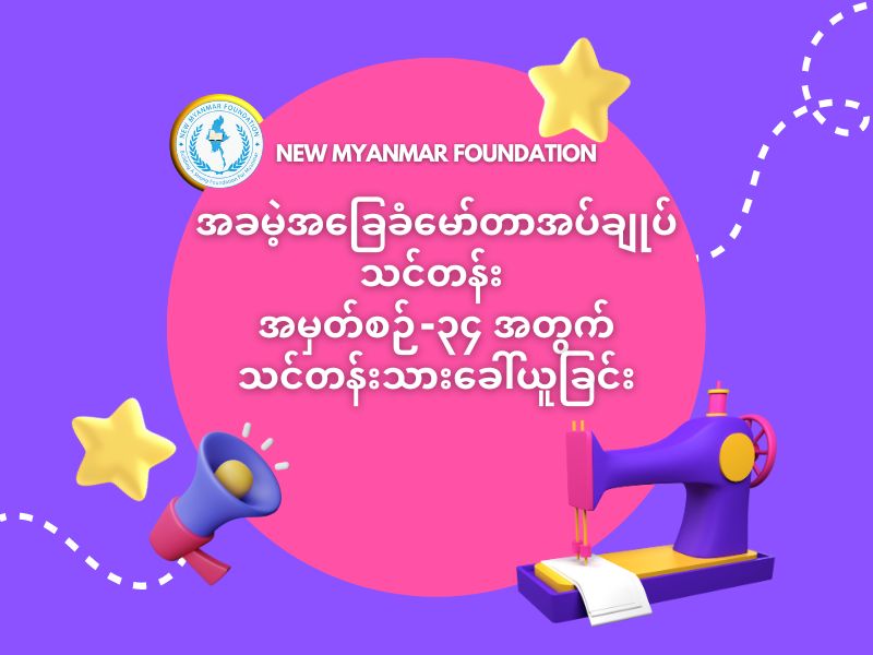 New Myanmar Foundation အနေဖြင့် မဲဆောက်ရောက် မြန်မာနိုင်ငံသားများ၏ အလုပ်အကိုင်အခွင့်အလမ်းအတွက် ရည်ရွယ်လျက် “အခမဲ့ အခြေခံ မော်တာစက်နင်းစက်ချုပ်သင်တန်း” ကို နိုဝင်ဘာလ (၁) ရက်နေ့တွင် ဖွင့်လှစ်သွားမည်ဖြစ်ပါသည်။