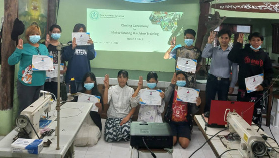 New Myanmar Foundation ၏ ၁၁-၁၁-၂၀၂၃ မှ ၂၀-၁၁-၂၀၂၃ ရက်နေ့အထိ (၁၀) ရက်ကြာ ကျင်းပဖွင့်လှစ်သည့် အခမဲ့ အခြေခံလျှပ်စစ် မော်တာစက်ချုပ်သင်တန်း အပတ်စဉ်-(၃၅) သင်တန်းဆင်းပွဲ ကို (၂၀-၁၁-၂၀၂၃) ရက်နေ့ ညနေ (၄) နာရီတွင် ထိုင်း-မြန်မာနယ်စပ်ဒေသရှိ Sewing Machine Training Center တွင် ကျင်းပ ပြုလုပ်ခဲ့ပါသည်။