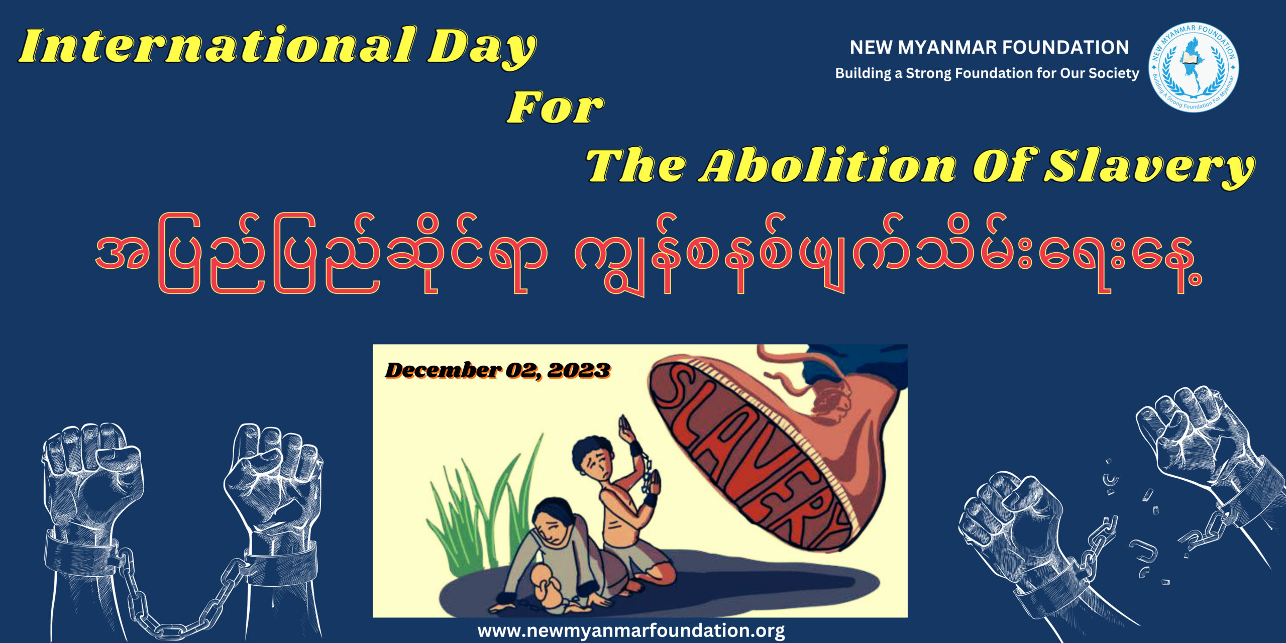 ယနေ့ ဒီဇင်ဘာလ ( ၂ ) ရက်နေ့၊ ၂၀၂၃ ခုနှစ်တွင်ကျရောက်သော အပြည်ပြည်ဆိုင်ရာ ကျွန်စနစ်ဖျက်သိမ်းရေးနေ့ ဆွေးနွေးပွဲအခမ်းအနားအား New Myanmar Foundation မှ ဦးစီး၍ ထိုင်း – မြန်မာ နယ်စပ် တစ်နေရာတွင် ကျင်းပပြုလုပ်ခဲ့ပါသည်။ အခမ်းအနားတွင် ဦးစွာပထမ New Myanmar Foundation ၏ Executive Director ဒေါက်တာစန်းအောင်မှ လူကို လူချင်း ကျွန်ပြုခြင်းစသည့် ကျွန်စနစ် ပပျောက် ဖျက်သိမ်းခြင်းဆိုင်ရာ အဖွင့်နှုတ်ခွန်းဆက်စကားဖြင့် ပြောကြားဆွေးနွေးခဲ့ပြီး ဆွေးနွေးပွဲသို တက်ရောက်လာသည့် ဧည့်သည်များမှလည်း လူသားအချင်းချင်း ခေါင်းပုံဖြတ်အမြတ်ထုတ်၍ ကျွန်ပြုစေခြင်းများပပျောက်ရေး နှင့်ပတ်သတ်သော အကြောင်းအရာများကို အသီးသီး မျှဝေဆွေးနွေးခဲ့ကြပါသည်။