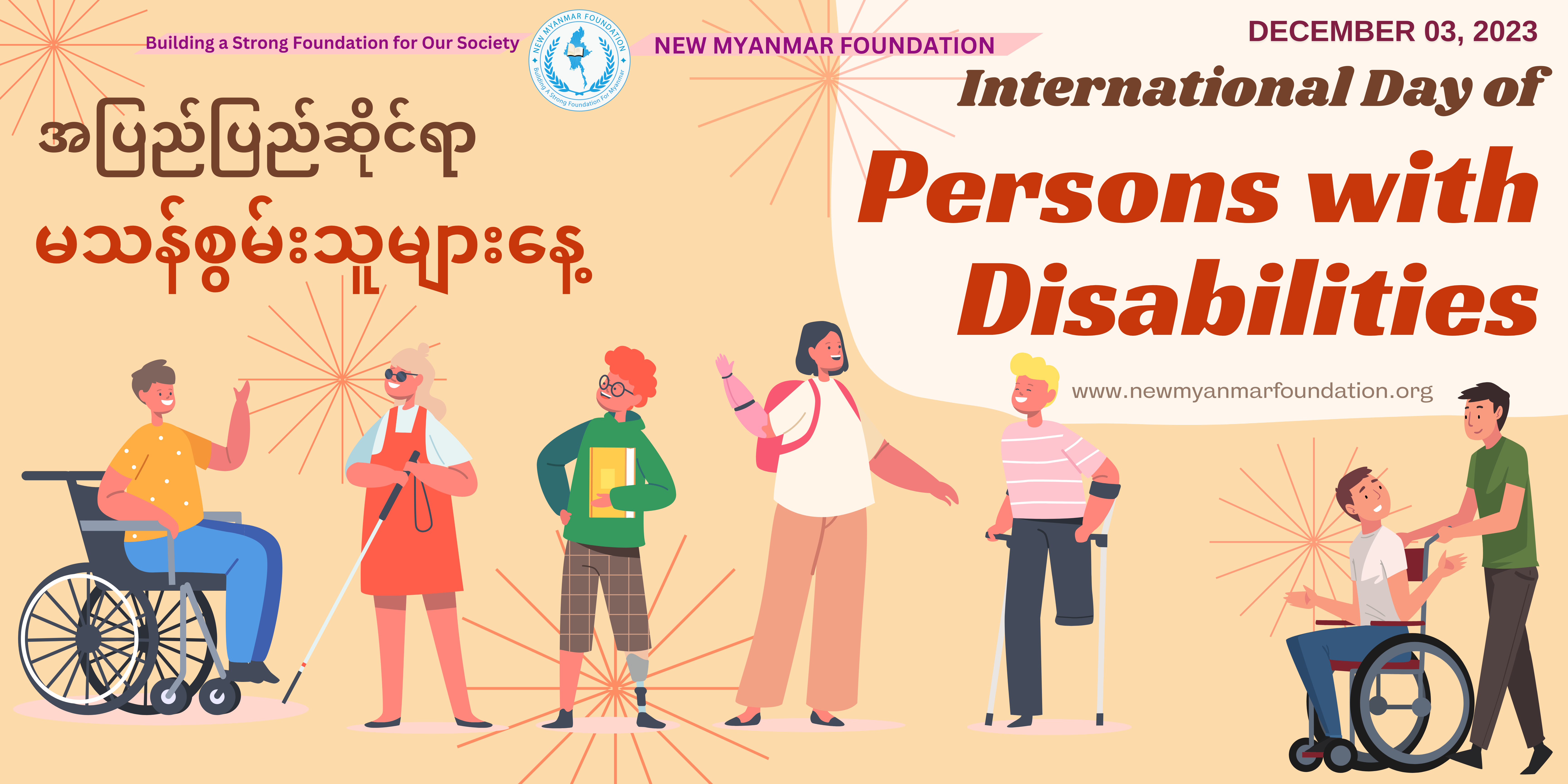 ယမန်နေ့ ဒီဇင်ဘာလ ( ၃ ) ရက်၊ ၂၀၂၃ ခုနှစ်တွင်ကျရောက်သော အပြည်ပြည်ဆိုင်ရာ မသန်စွမ်းသူများနေ့ အထိမ်းအမှတ် စကားဝိုင်းဆွေးနွေးပွဲ အခမ်းအနားအား New Myanmar Foundation မှ ဦးစီး၍ ထိုင်း – မြန်မာ နယ်စပ် တစ်နေရာတွင် ကျင်းပပြုလုပ်ခဲ့ပါသည်။ အခမ်းအနားတွင် ပထမဦးစွာ New Myanmar Foundation ၏ Executive Director ဒေါက်တာစန်းအောင်မှ မသန်စွမ်းသူများအားဖေးမ၍ တန်းတူညီမျှဆက်ဆံရေး စသည့် အကြောင်းအရာများဖြင့် အဖွင့်နှုတ်ခွန်းဆက်စကား ပြောကြားဆွေးနွေးခဲ့ပါသည်။ ဆက်လက်၍ အထူးဖိတ်ကြားထားသော မြန်မာ့ဒီမိုကရေစီအရေး နှင့် လူ့အခွင့်အရေးတက်ကြွလှုပ်ရှားသူ မသန်စွမ်း အမျိုးသား/အမျိူးသမီးများမှ Online မှတဆင့်လည်းကောင်း၊ ဆွေးနွေးပွဲကျင်းပရာ အခမ်းအနားသို့ ကိုယ်တိုင်တက်ရောက်၍လည်းကောင်း ဆွေးနွေးခဲ့ကြပြီး အခြားသော ဖိတ်ကြားထားသည့် ဧည့်သည်များမှလည်း မသန်စွမ်းသူများအပေါ် လူသားချင်းစာနာမှုရှိရေး၊ ၎င်းတို့၏စိတ်ပိုင်းဆိုင်ရာ၊ ရုပ်ပိုင်းဆိုင်ရာပြန်လည်ထူထောင်ရေး စသည့် ကဏ္ဍအသီးသီးနှင့်ပတ်သတ်၍ မျှဝေဆွေးနွေးခဲ့ကြပါသည်။