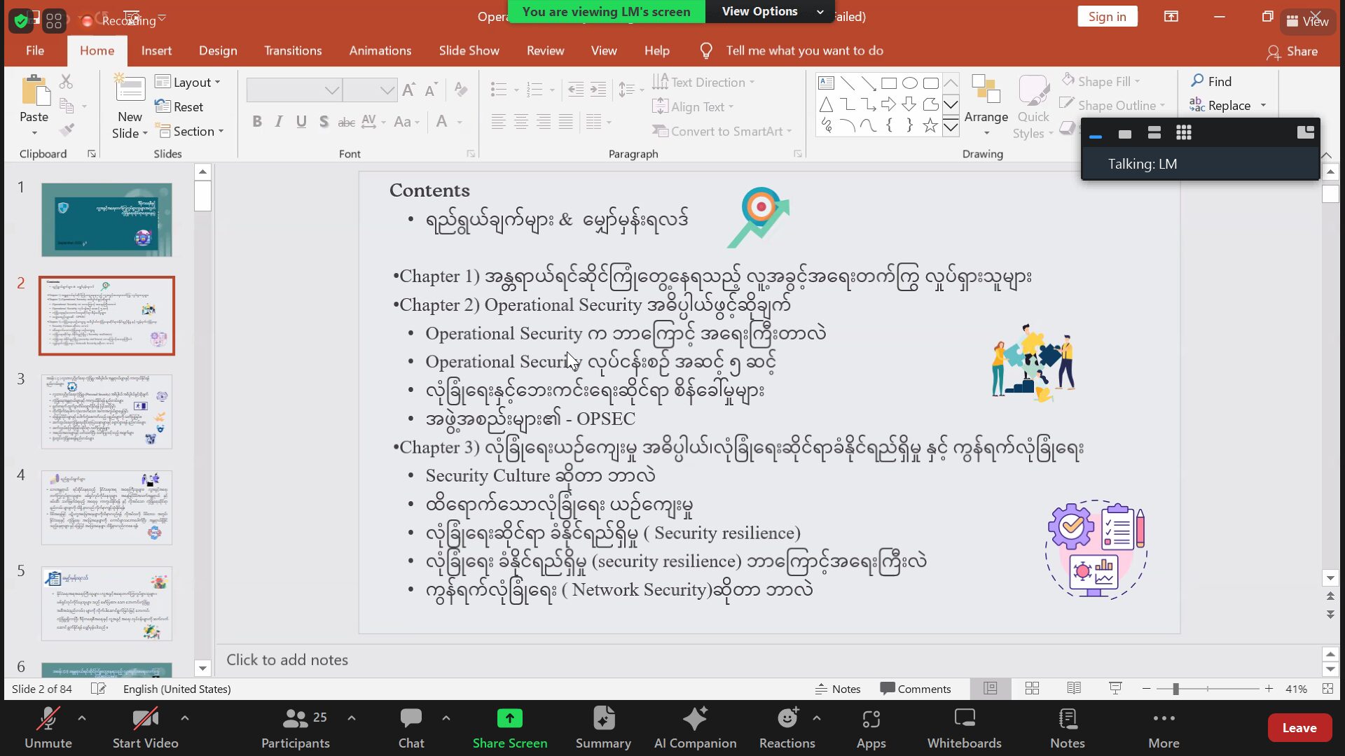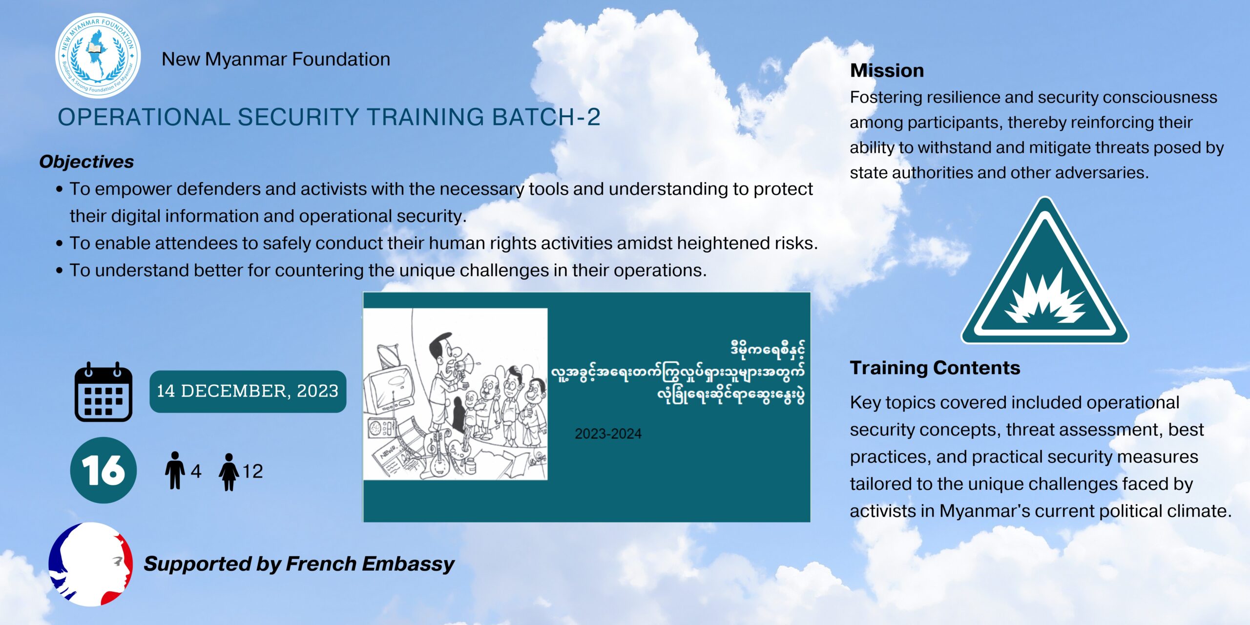 Conducted on December 14, 2023, by the New Myanmar Foundation and led by Trainer Mr. Lwin Myint, Operational Security Training Batch 2 gathered 16 participants, predominantly 12 females and 4 males from various sectors such as human rights activism and civil society organizations. The training aimed to equip participants with essential knowledge and skills to enhance their personal security and digital presence, covering operational security concepts, threat assessment, best practices, and practical security measures tailored to the challenges faced by activists in Myanmar’s political climate. The objective was to empower participants to protect their digital information and operational security, enabling them to safely conduct human rights activities amidst heightened risks. Interactive discussions focused on strategies for information compartmentalization, managing interactions with military authorities, and evading surveillance. The structured agenda included introductions, two parts of operational security training, a discussion session, feedback collection, and a closing summary.