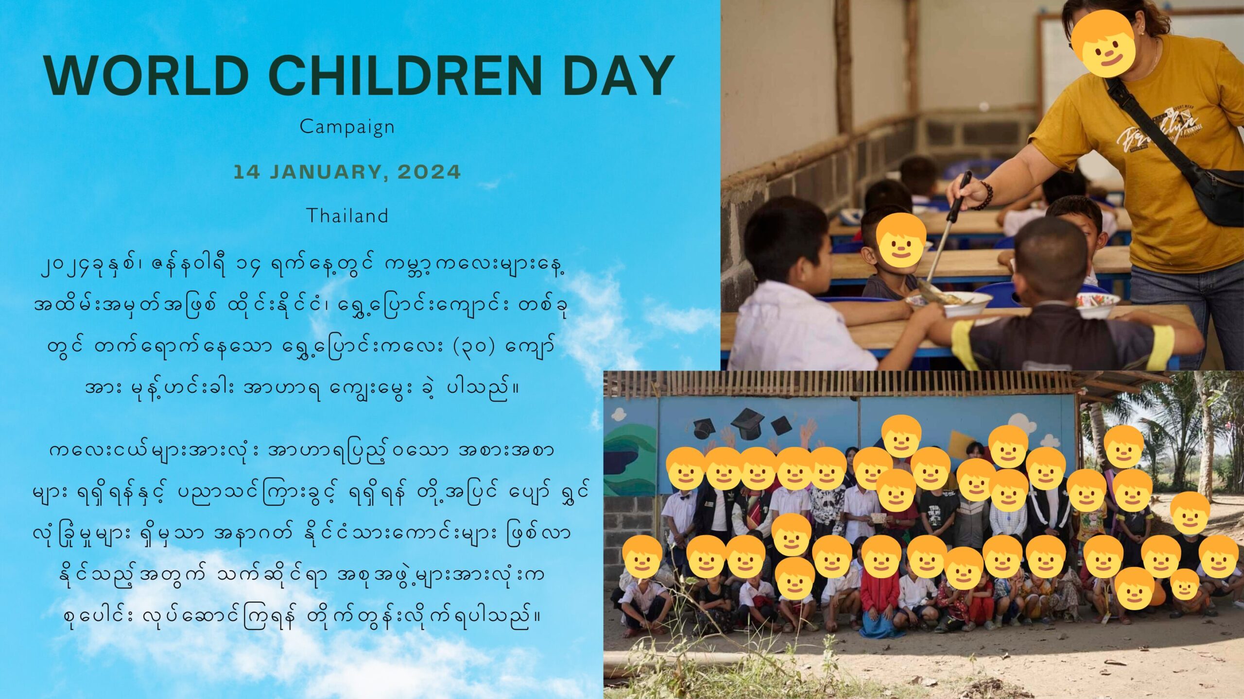 On January 14, 2024, the Women Lead Resource Center (WLRC); partner of New Myanmar Foundation (NMF) organized a meat support program at Migrant School in Thailand, benefiting over 30 migrant children in celebration of World Children’s Day. This initiative aimed to provide a nutritious meal and bring joy to these vulnerable children, who often face food insecurity and other challenges. The program underscored the significant role of communities in ensuring the well-being of all children, regardless of their background, by contributing to their physical and mental well-being and fostering a sense of community.