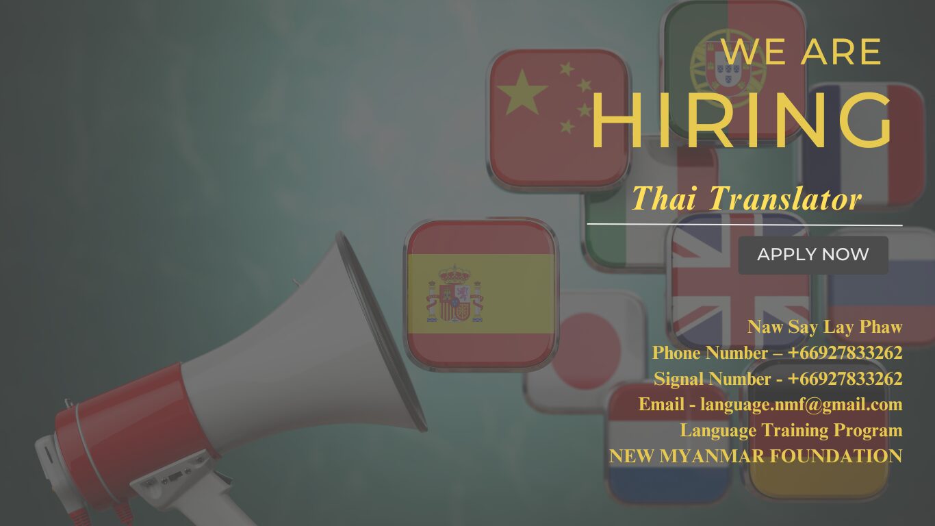 NEW MYANMAR FOUNDATION ၏ ရုံးတွင် (တစ်ပတ် (၃) ရက်)၊ တစ်ရက်လျှင် (၃) နာရီ တာဝန်ထမ်းဆောင်နိုင်မည့် ထိုင်းဘာသာစကား ကျွမ်းကျင်စွာ ရေးသား/ပြောဆိုနိုင်သည့် ထိုင်းစကားပြန်တစ်ဦးအတွက် လျှောက်လွှာများခေါ်ယူနေပါသည်။