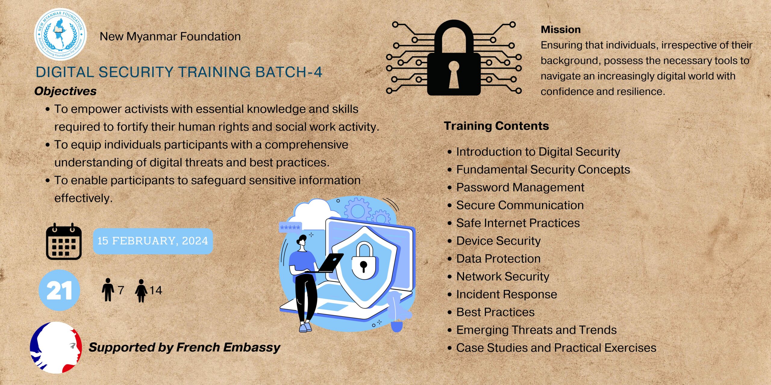 On February 15, 2024, the New Myanmar Foundation conducted the fourth digital security training session, with 21 participants, including 7 males and 14 females, from diverse backgrounds. This session aimed to provide attendees with crucial knowledge and practical skills to safeguard their digital information and online presence effectively. Through discussions, participants explored topics such as encryption tools, secure communication practices, and best practices for digital hygiene.