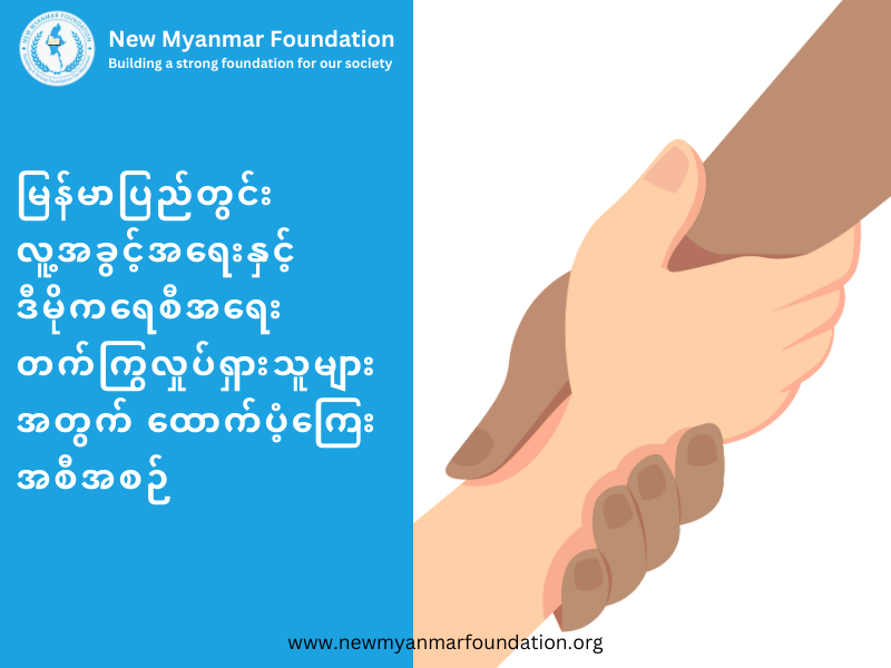 မဲဆောက်ရောက်ဒီမိုကရေစီအင်အားစုများရှင့် ကိုယ်စိတ်နှစ်ဖြာ ကျန်းမာ ချမ်းသာ ကြပါစေ ။ 𝐍𝐞𝐰 𝐌𝐲𝐚𝐧𝐦𝐚𝐫 𝐅𝐨𝐮𝐧𝐝𝐚𝐭𝐢𝐨𝐧 တွင် ပုံမှန် လစဉ် ရိက္ခာလျှောက်ထားနိုင်သူများမှာ - မဲဆောက်ရောက် ဒီမိုကရေစီ အင်အားစုများထဲမှ မိသားစုဝင်ငွေမရှိသူများ ၊ ကိုယ်ဝန်ဆောင်မိခင်များ ၊ မသန်စွမ်းသူများ ၊...