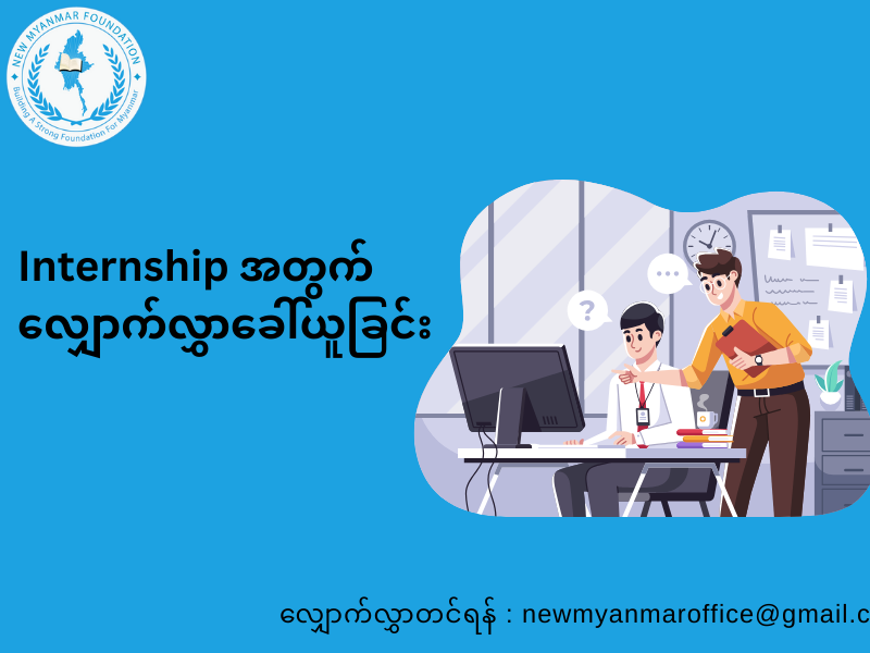 ပြည်ပရောက် မြန်မာနိုင်ငံသားများ ရုံးလုပ်ငန်းအတွေ့အကြုံရရှိစေရန် နှင့် အလုပ်အကိုင်များရှာဖွေရှာတွင် အထောက်အကူပြုနိုင်စေရန် ရည်ရွယ်၍ NEW MYANMAR FOUNDATION မှ Internship (၂ ဦး) အတွက် လျှောက်လွှာများခေါ်ယူနေပါသည်။