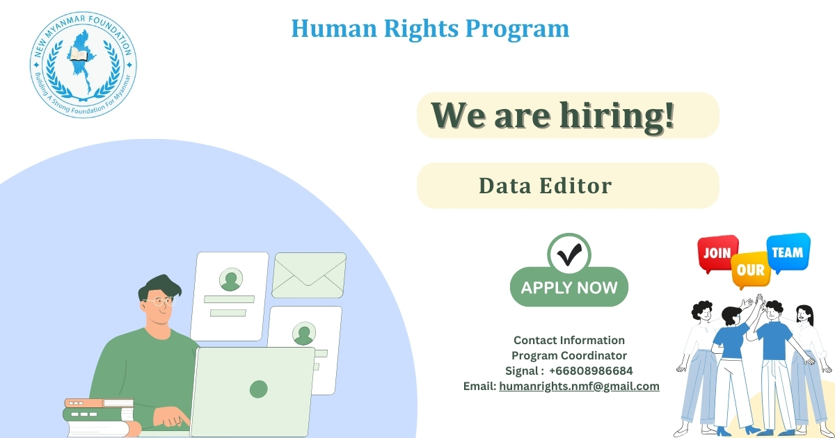 New Myanmar Foundation မှ Human Rights Program ကို ၂၀၂၃ ခုနှစ်မှ ၂၀၂၇ ခုနှစ်အထိ နှစ်စဉ်စီမံချက်ဖြင့် လုပ်ဆောင်သွားမည်ဖြစ်ရာ လူ့အခွင့်အရေးချိုးဖောက်မှု Data အချက်အလက်များအား စိစစ်ပြင်ဆင်ခြင်း၊ အစီရင်ခံစာပြုစုခြင်း လုပ်ငန်းအတွက် (Data Editor) လျှောက်လွှာများ ခေါ်ယူနေပါသည်။