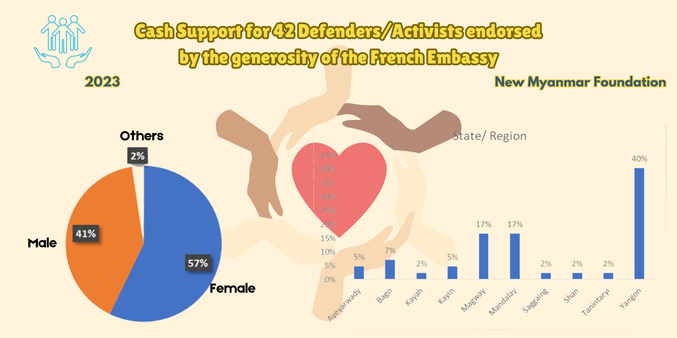 40 defenders were initially targeted to benefit from the French Embassy’s project. Due to increased need, the New Myanmar Foundation (NMF) supported an additional 2 HRDers as NMF contribution for this program, bringing the total to 42 defenders who benefited from this project. The impact included improved safety and well-being, reduced threats, and empowered HRDs to persist in their human rights or community efforts. The support was used for various needs, including relocation within and outside Myanmar, basic necessities, medical expenses, digital equipment, and safehouse rent. The program achieved significant outcomes, such as enhanced resilience, ongoing human rights protection, and strengthened networks among defenders, contributing to long-term positive societal change.