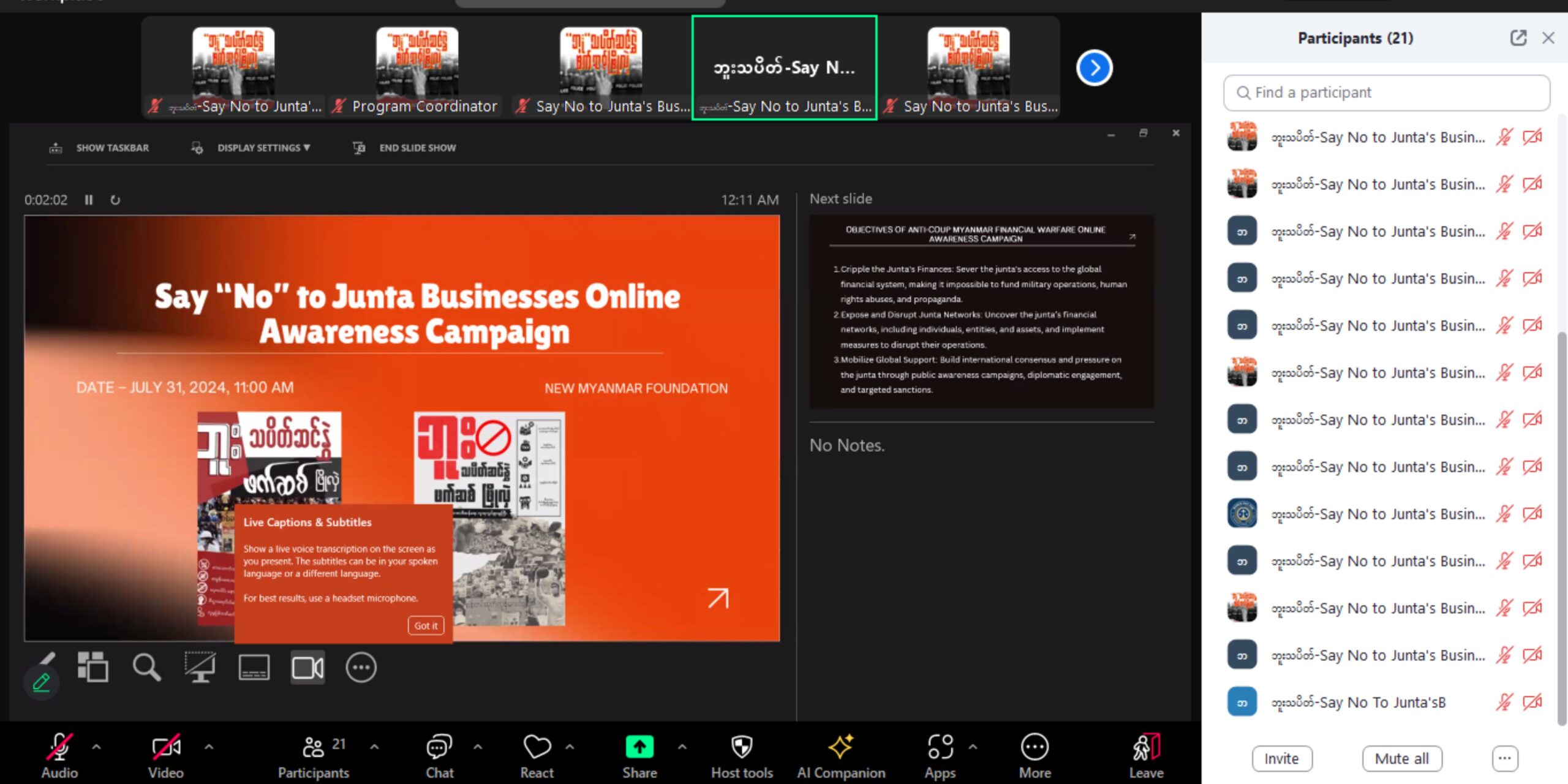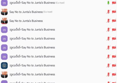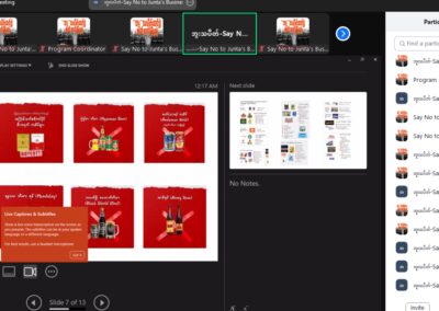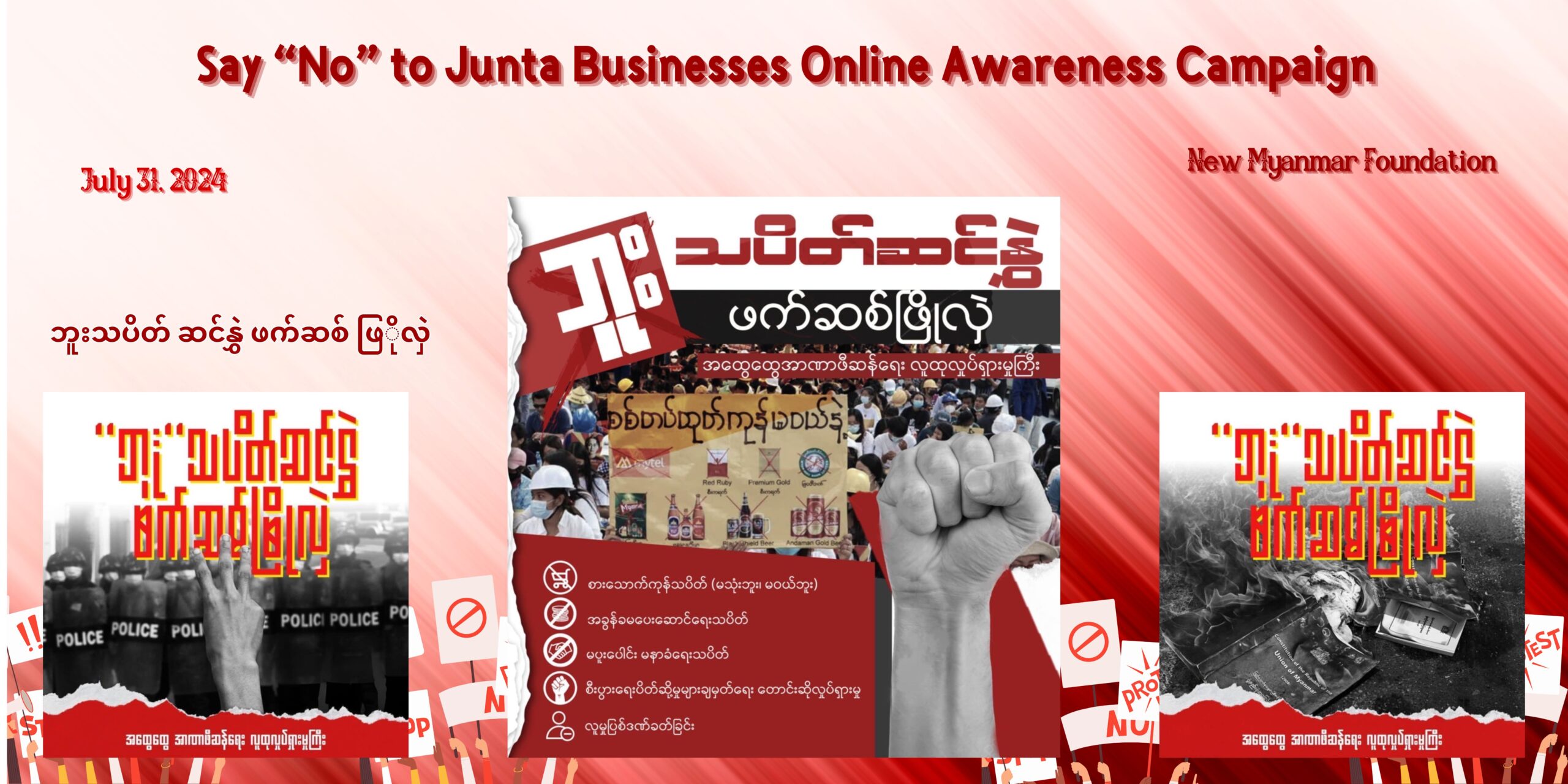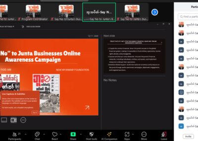 On July 31, 2024, the New Myanmar Foundation (NMF) and partners held an online awareness session for the “Say No to Junta Businesses” campaign, attended by 21 participants. The session focused on educating attendees about the campaign’s objectives to weaken the military junta’s financial support by boycotting junta-affiliated businesses and products. Discussions covered the campaign’s strategic plan, digital outreach efforts, public education, and interactive engagement methods.