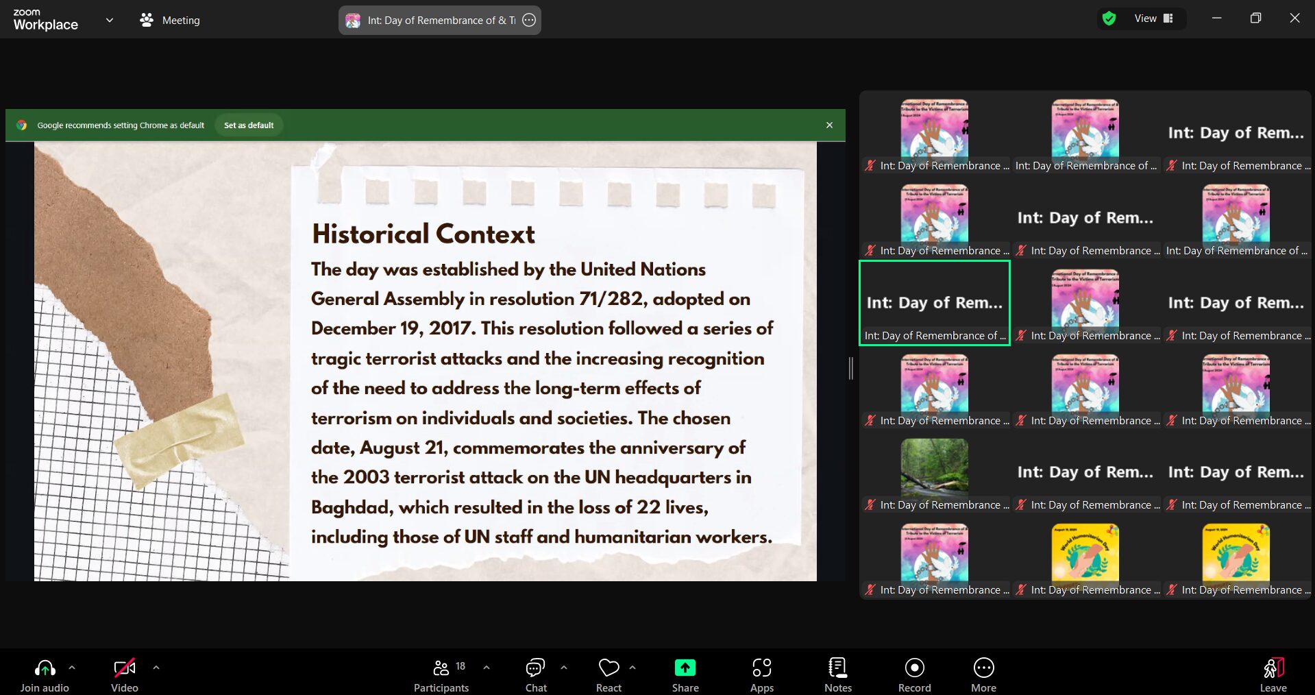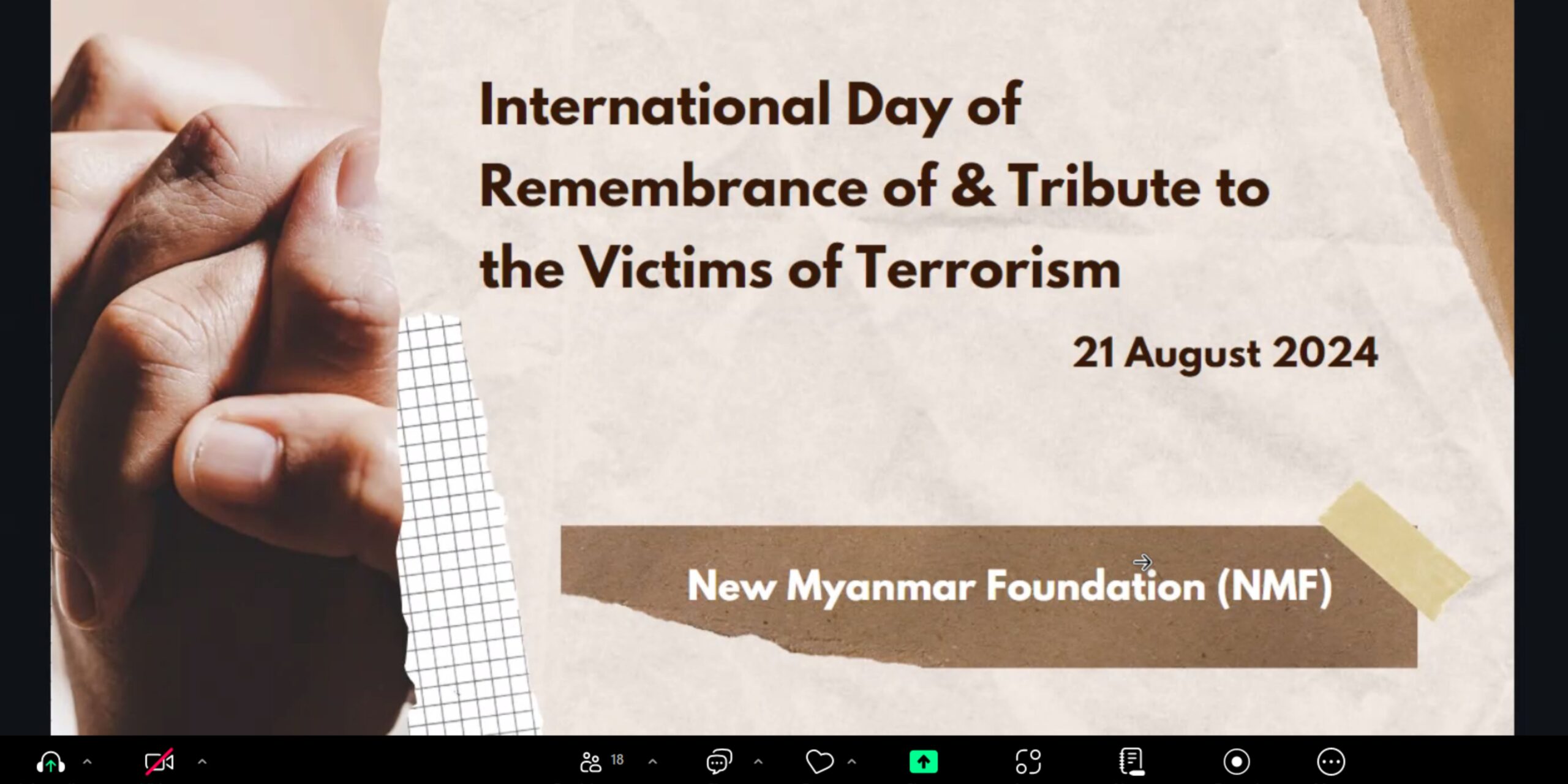 On August 21, 2024, the New Myanmar Foundation (NMF) conducted an online campaign to commemorate the International Day of Remembrance of and Tribute to the Victims of Terrorism, bringing together 18 participants via Zoom from 11:00 AM to 12:00 PM (BKK Time). The session served as a platform for reflecting on the devastating impact of terrorism on individuals, families, and communities, both in Myanmar and globally. Participants shared personal stories and discussed the long-lasting psychological, social, and economic consequences faced by victims and survivors.