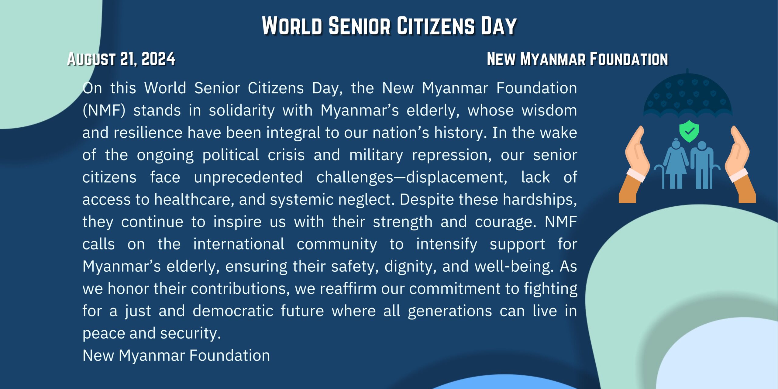 On this World Senior Citizens Day, the New Myanmar Foundation (NMF) stands in solidarity with Myanmar’s elderly, whose wisdom and resilience have been integral to our nation’s history. In the wake of the ongoing political crisis and military repression, our senior citizens face unprecedented challenges—displacement, lack of access to healthcare, and systemic neglect.