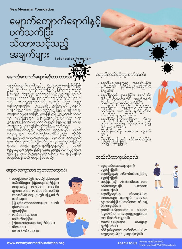 ရာသီတုပ်ကွေးနဲ့ ပက်သက်ပြီး သိထားသင့်သည့် အချက်များ နှင့် မျောက်ကျောက်ရောဂါနဲ့ပက်သက်ပြီး ရောဂါမကူးစက်နိုင်စေရန် နဲ့ ကြိုတင်ကာကွယ်နိုင်စေရန် New Myanmar foundation, Telehealth program မှတင်ပြလိုက်ရပါသည်။