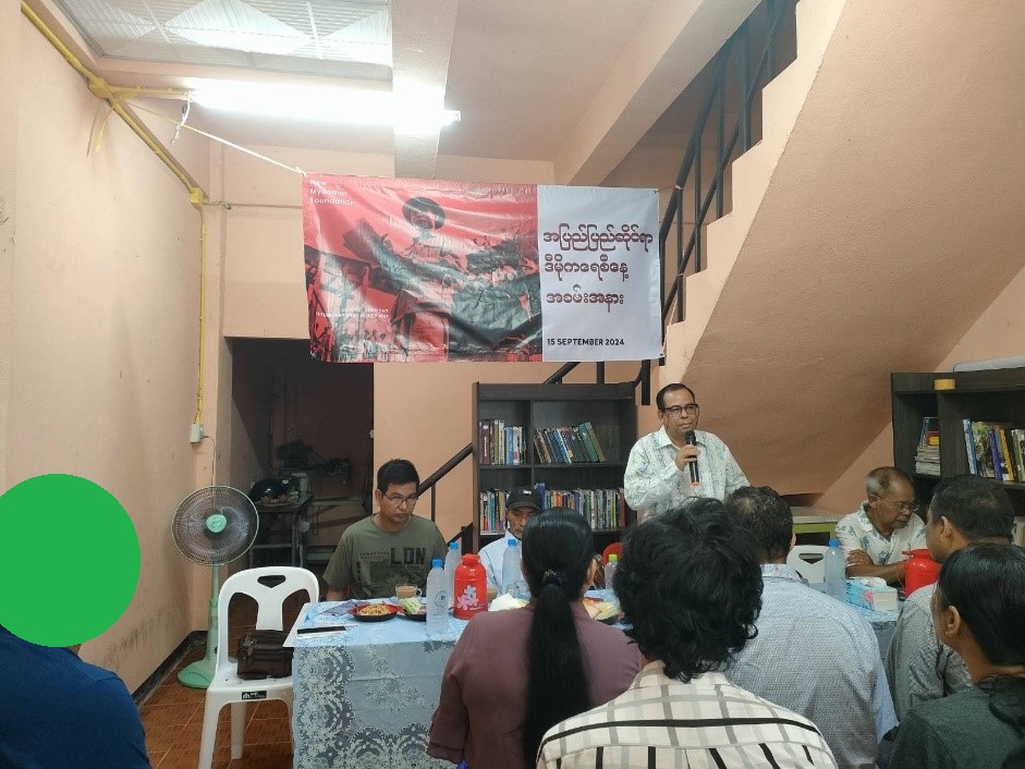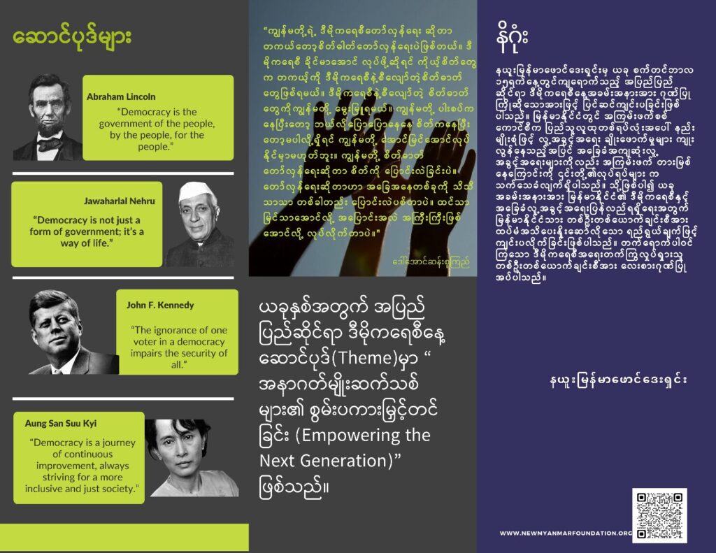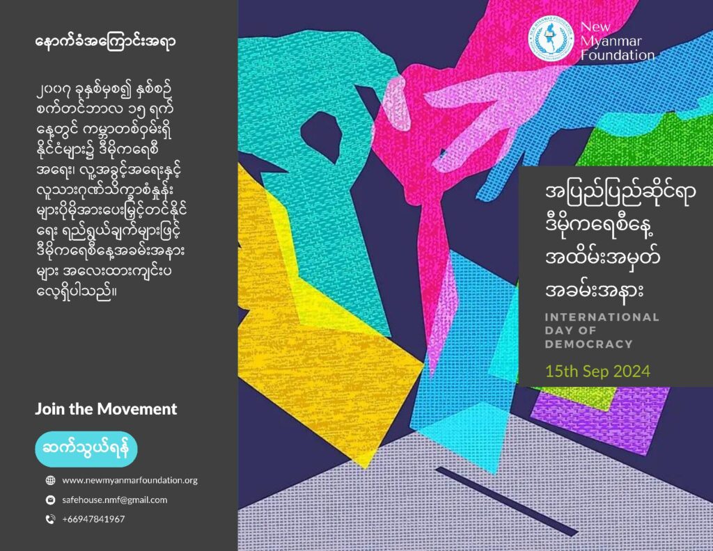 ၂၀၂၄ခုနှစ်၊ စက်တင်ဘာလ (၁၅) ရက်နေ့တွင် ကျရောက်သော “အပြည်ပြည်ဆိုင်ရာ ဒီမိုကရေစီနေ့ အထိမ်းအမှတ် အခမ်းအနားပွဲအား New Myanmar Foundation မှ ဦးစီး၍ ထိုင်း-မြန်မာနယ်စပ် တနေရာတွင် ကျင်းပပြုလုပ်ခဲ့ပါသည်။
