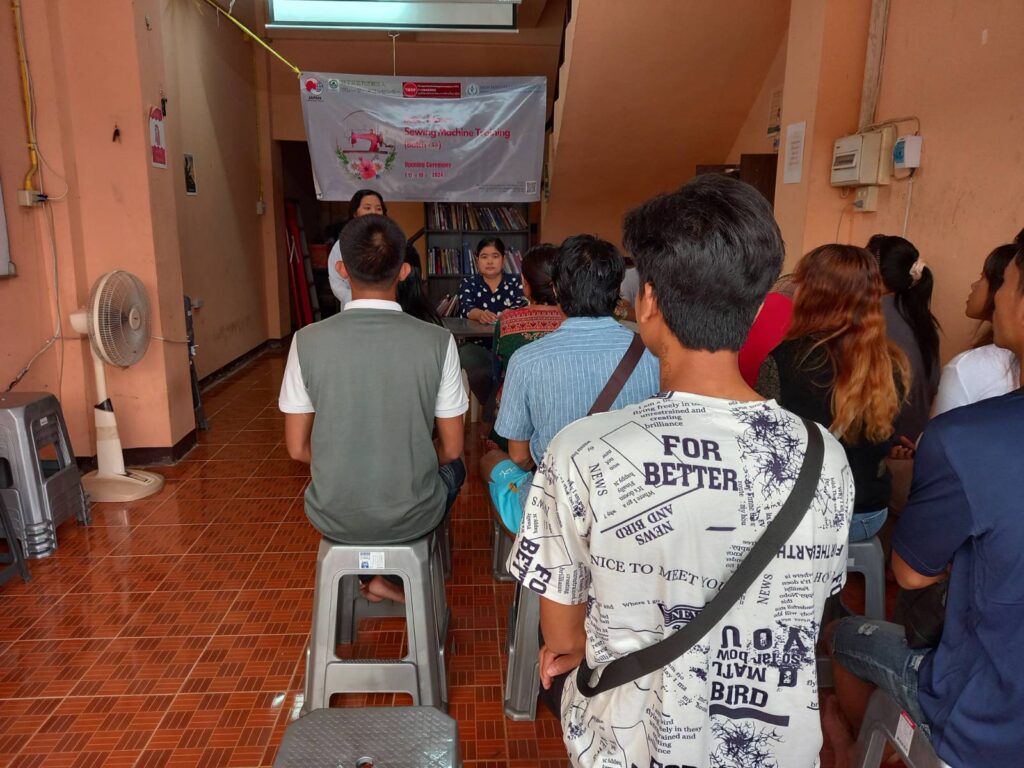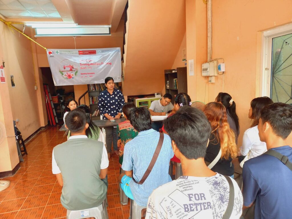 ဦးစွာပထမ သင်တန်းတာဝန်ခံ နော်စေးမှ ယခုသင်တန်းအား Japan’s Official Development Assistance-ODA မှ ထောက်ပံ့ပေးထားခြင်းဖြစ်ပြီး သင်တန်းဖွင့်လှစ်ရခြင်း၏ အဓိကရည်ရွယ်ချက်မှာ အမျိုးသမီးများ၏ စွမ်းဆောင်ရည်မြင့်မားလာစေရန် နှင့် အထည်ချုပ်စက်ရုံများတွင် စက်ချုပ်အလုပ်အကိုင်အား အလွယ်တကူရရှိရန် ရည်ရွယ်ဖွင့်လှစ်ခြင်းဖြစ်ကြောင်း၊ သင်တန်းကာလ (၁၅) ရက်အတွင်း စည်းကမ်းများကို လေးစားလိုက်နာရန်၊ သင်တန်းကာလအတွင်း မိသားစုဝင်များကဲ့သို့ ပေါင်းသင်းဆက်ဆံကြရန်နှင့် သင်တန်းအားလုံး ပြီးဆုံးသည်အထိ တက်ရောက်ပေးကြရန်၊ သင်တန်းကာလ ပြီးဆုံးသွားပါက လုပ်ငန်းခွင်သို့ ဝင်ရောက်နိုင်ရန် ကြိုးစားရှာဖွေပေးသွားမည်ဖြစ်ကြောင်း၊ မိမိတို့အစွမ်းအစဖြင့် ရပ်တည်နိင်ပြီး တခြားခက်ခဲနေသူများကိုလည်း ပြန်လည်ကူညီပေးရန်တို့အား ပြောကြားခဲ့ပါသည်။