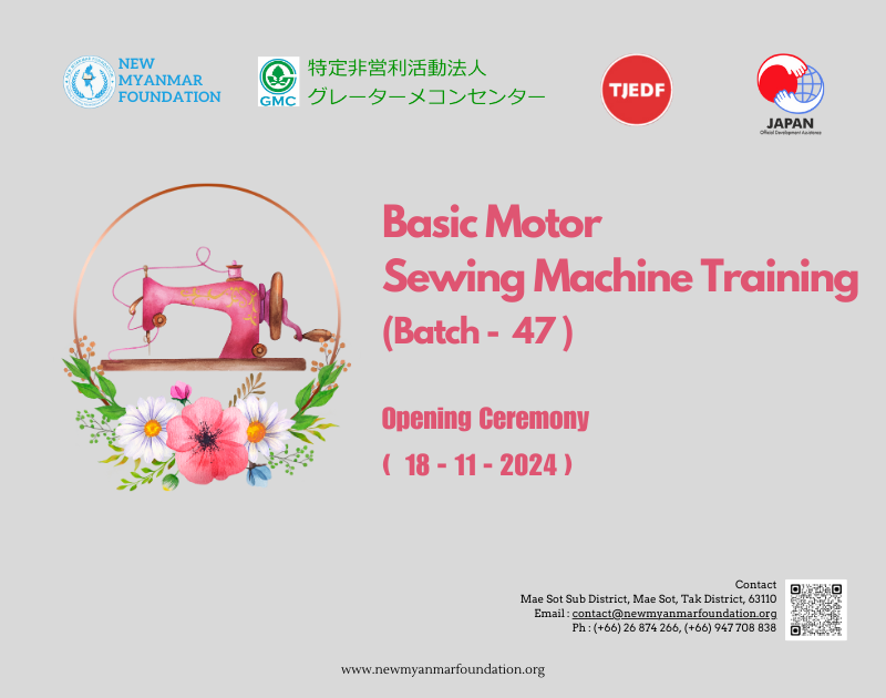 Japan’s Official Development Assistance-ODA ၏ ပံ့ပိုးကူညီမှုဖြင့် New Myanmar Foundation မှ ဦးစီးကျင်းပပြုလုပ်သော (၇) ရက်ကြာ အခမဲ့ အခြေခံမော်တာ စက်ချုပ်သင်တန်း” အပတ်စဉ် (၄၇) ဖွင့်ပွဲအခမ်းအနား ကို ၂၀၂၄ ခုနှစ်၊ နိုဝင်ဘာလ (၁၈) ရက်နေ့တွင် မဲဆောက်မြို့ရှိ နယူးမြန်မာ ဖောင်ဒေးရှင်း၏ စက်ချုပ်သင်တန်းခန်းမ၌ ကျင်းပပြုလုပ်ခဲ့ပါသည်။ ယခုသင်တန်းအပတ်စဉ်တွင် အမျိုးသမီးသင်တန်းသူ (၁၁) ဦးနှင့် အမျိုးသား သင်တန်းသား (၂) ဦး တက်ရောက်သင်ယူကြမည် ဖြစ်ပါသည်။