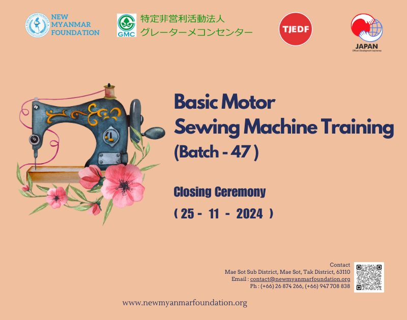 ၂၀၂၄ ခုနှစ် နိုဝင်ဘာလ (၁၈) ရက်နေ့ မှ (၂၅) ရက်အထိ (၇) ရက်ကြာ ဖွင့်လှစ်သင်ကြားပေးခဲ့သော 𝗡𝗲𝘄 𝗠𝘆𝗮𝗻𝗺𝗮𝗿 𝗙𝗼𝘂𝗻𝗱𝗮𝘁𝗶𝗼𝗻 ၏ အခမဲ့အခြေခံလျှပ်စစ်မော်တာစက်ချုပ်သင်တန်း အပတ်စဉ် (၄၇) သင်တန်းဆင်းပွဲ အခမ်းအနား ကို ၂၀၂၄ ခုနှစ်၊ နိုဝင်ဘာလ (၂၃) ရက်နေ့ နေ့လည် (၂) နာရီတွင် ထိုင်း-မြန်မာနယ်စပ်ဒေသရှိ နယူးမြန်မာ ဖောင်ဒေးရှင်း၏ 𝐒𝐞𝐰𝐢𝐧𝐠 𝐌𝐚𝐜𝐡𝐢𝐧𝐞 𝐓𝐫𝐚𝐢𝐧𝐢𝐧𝐠 𝐂𝐞𝐧𝐭𝐞𝐫 တွင် ကျင်းပပြုလုပ်ခဲ့ပါသည်။