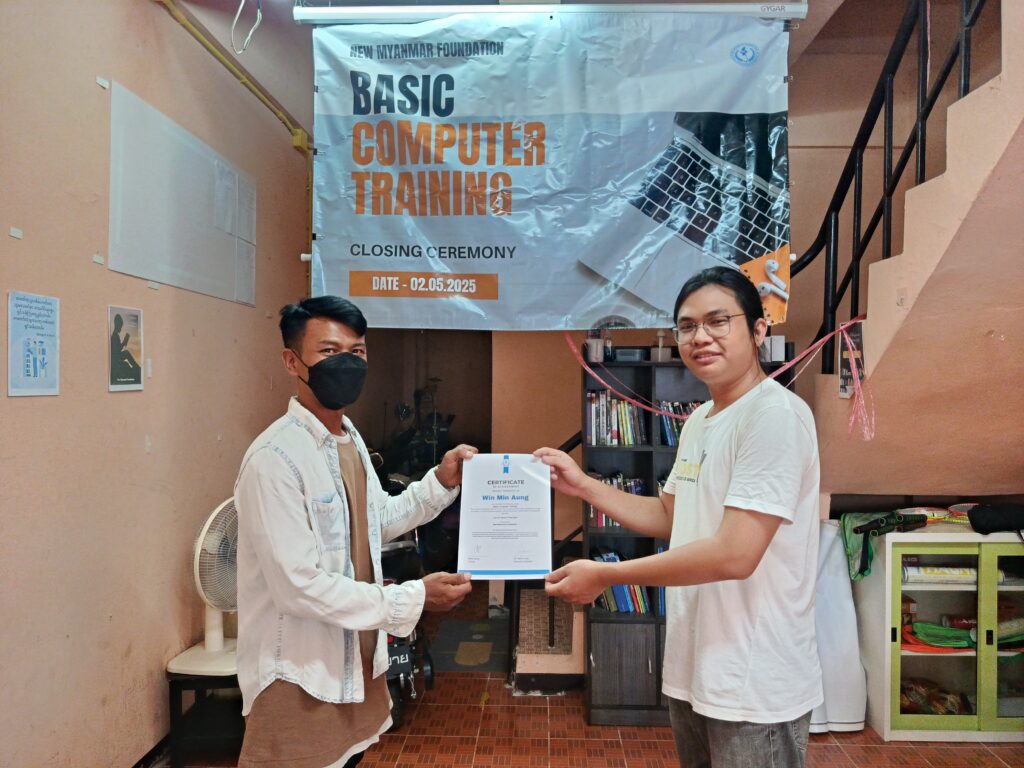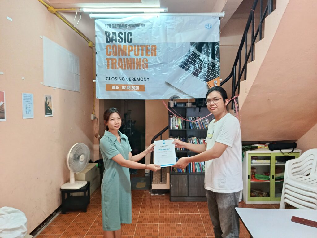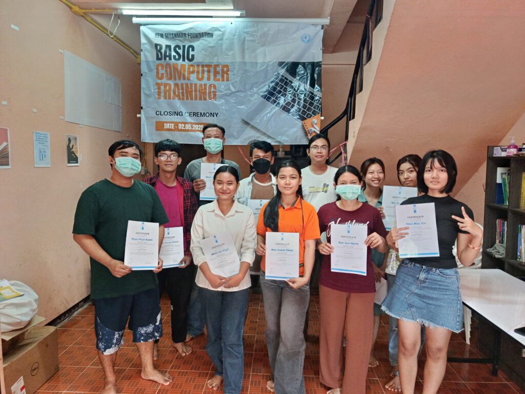 ၂၀၂၅ ခုနှစ်၊ ဧပြီလ (၂၃) ရက်နေ့ မှ မေလ (၂) ရက်အထိ (၇) ရက်ကြာ ဖွင့်လှစ်သင်ကြားပေးခဲ့သော နယူးမြန်မာ ဖောင်ဒေးရှင်း (New Myanmar Foundation) ၏ အခမဲ့အခြေခံကွန်ပျုတာသင်တန်း အပတ်စဉ် (၁) သင်တန်းဆင်းပွဲ အခမ်းအနား ကို ၂၀၂၅ ခုနှစ်၊ မေလ (၂) ရက်နေ့ ညနေ (၀၄ : ၀၀) နာရီတွင် ထိုင်း-မြန်မာနယ်စပ် ဒေသရှိ နယူးမြန်မာ ဖောင်ဒေးရှင်း၏ ကွန်ပျုတာသင်တန်းခန်းမတွင် ကျင်းပပြုလုပ်ခဲ့ပါသည်။
