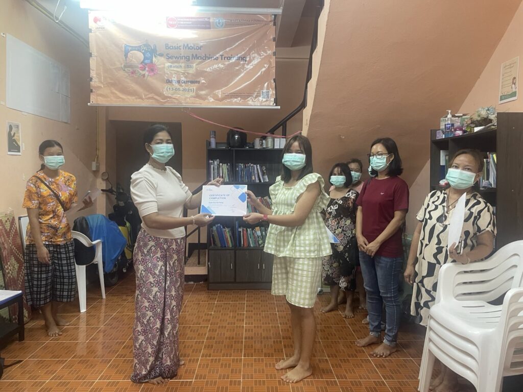 ၂၀၂၅ ခုနှစ်၊ မေလ (၂) ရက်နေ့ မှ (၁၃) ရက်နေ့အထိ (၁၂) ရက်ကြာ ဖွင့်လှစ်သင်ကြားပေးခဲ့သော New Myanmar Foundation ၏ အခမဲ့အခြေခံလျှပ်စစ်မော်တာ စက်ချုပ်သင်တန်း အပတ်စဉ် (၅၈) သင်တန်းဆင်းပွဲ အခမ်း အနား ကို ၂၀၂၅ ခုနှစ်၊ မေလ (၁၃) ရက်နေ့ ညနေ (၀၄: ၃၀) နာရီတွင် ထိုင်း-မြန်မာနယ်စပ်ဒေသရှိ နယူးမြန်မာ ဖောင်ဒေးရှင်း၏ စက်ချုပ်သင်တန်းခန်းမတွင် ကျင်းပပြုလုပ်ခဲ့ပါသည်။