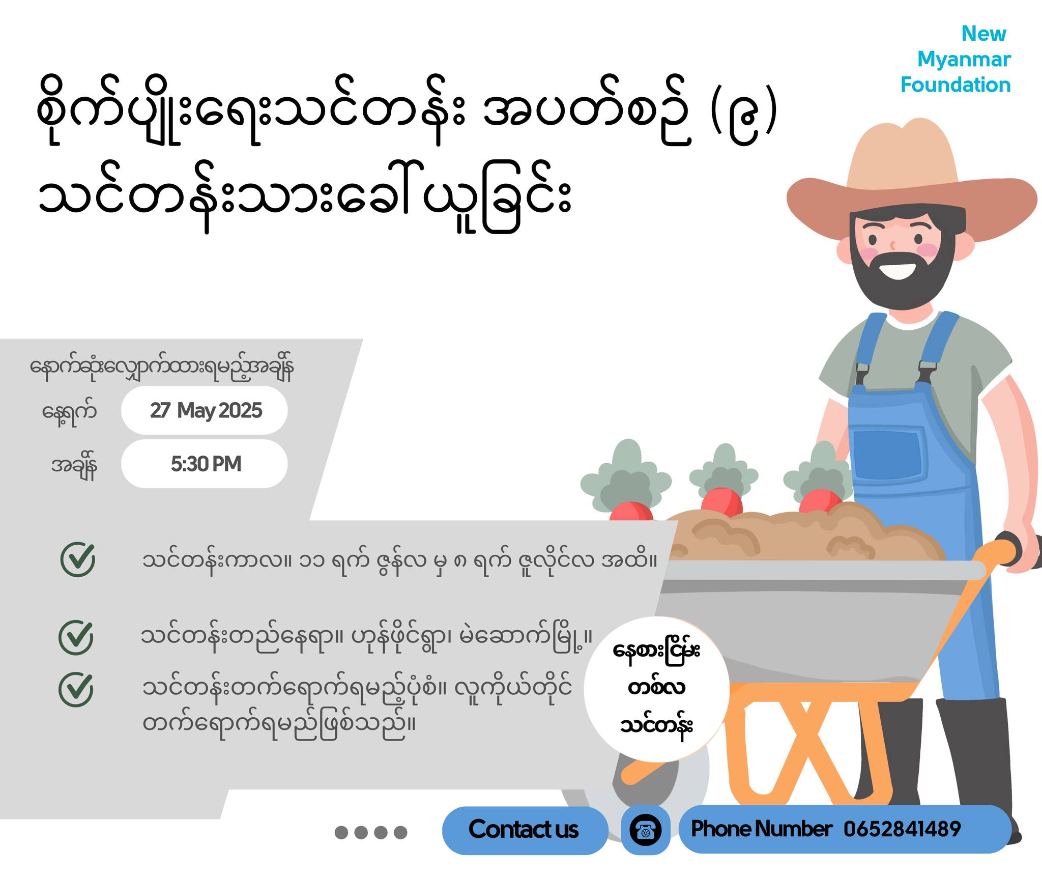မှတ်ချက်။ ။ New Myanmar Foundation မှ စိုက်ပျိုးရေးသင်တန်းများအား ၂၅ ရက်၊ နိုဝင်ဘာလ၊ ၂၀၂၄ ခုနှစ်မှစတင်ခဲ့ရာ ယခုအခါအပတ်စဉ် (၈)ခုအား အောင်မြင်စွာသင်တန်းပို့ချပေးခဲ့ပြီး သင်တန်းသား/သူ (၇၄)ဦးအား မွေးထုတ်နိုင်ခဲ့ပြီဖြစ်ပါသည်။