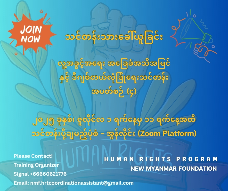 နယူးမြန်မာဖောင်ဒေးရှင်းမှ ၂၀၂၅ ခုနှစ် ဇူလိုင်လ (၁) ရက်နေ့မှ (၁၁) ရက်နေ့အထိ Zoom Platform ကို အသုံးပြုကာ အွန်လိုင်းမှဖွင့်လှစ်ပို့ချပေးမည့် လူ့အခွင့်အရေးအခြေခံနှင့် ဒီဂျစ်တယ် ဘေးကင်းလုံခြုံရေး သင်တန်းသို့ တက်ရောက်လိုသူများအနေနဲ့ အောက်ပါ Google Form တွင် Register လုပ်နိုင်ပါသည်။ ဤသင်တန်း အပတ်စဉ်အတွက် ယခုလျှောက်လွှာ ခေါ်ယူခြင်းမှ သတ်မှတ်ချက်နှင့်ကိုက်ညီသူများကို ရွေးချယ်ကာ ဆက်သွယ်တက်ရောက်စေမည် ဖြစ်ပါသည်။