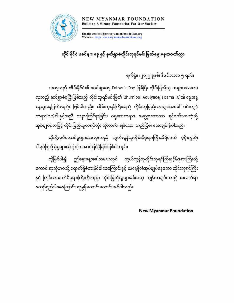 ယနေ့သည် ထိုင်းနိုင်ငံ၏ ဖခင်များနေ့ Father’s Day ဖြစ်ပြီး ထိုင်းပြည်သူ အများလေးစား လှသည့် နတ်ရွာစံခဲ့ပြီးဖြစ်သည့် ထိုင်းဘုရင်မင်းမြတ် Bhumibol Adulyadej (Rama IX)၏ မွေးနေ့ နေ့ထူးနေ့မြတ်လည်း ဖြစ်ပါသည်။ ထိုင်းဘုရင်ကြီးသည် တိုင်းသူပြည်သားများအပေါ် မင်းကျင့် တရား(၁၀)ပါးနှင့်အညီ သနားကြင်နာခြင်း၊ ဂရုဏာတရား၊ မေတ္တာထားကာ ရင်ဝယ်သားကဲ့သို့ အုပ်ချုပ်ခဲ့သဖြင့် ထိုင်းပြည်သူတရပ်လုံး တိုးတက်၊ ချမ်းသာ၊ တည်ငြိမ်၊ အေးချမ်းခဲ့ပါသည်။