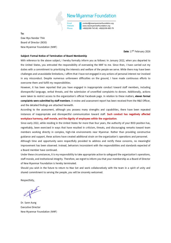 ထိုင်းနိုင်ငံ၊ မဲဆောက်မြို့သို့ ရောက်ရှိနေကြသောမြန်မာပြည်သူများအတွက် အလုပ်အကိုင်အခွင့် အလမ်းရရှိစေရန်ရည်ရွယ်၍နယူးမြန်မာဖောင်ဒေးရှင်းမှ “အခမဲ့အခြေခံမော်တာစက်ချုပ်သင်တန်း” များကို ၂၀၂၁ခုနှစ်၊ ဧပြီလမှစတင်၍ ဖွင့်လှစ်သင်ကြားပေးလျက်ရှိရာ ၂၀၂၆ ခုနှစ်၊ မတ်လ ၁၆ရက်နေ့မှ...